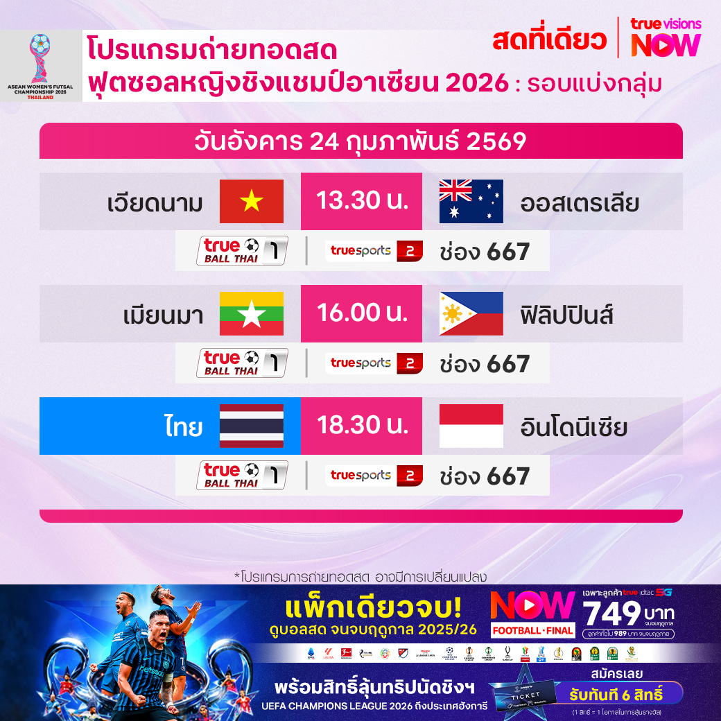 วันนี้มีอะไรดูที่ ทรูวิชั่นส์ ประจำวันอังคารที่ 24 กุมภาพันธ์ 69 ยังคงมีกีฬาที่น่าสนใจให้ได้ตามลุ้นตามเชียร์กันเหมือนเดิม โดยในส่วนของฟุตบอลยังมีศึก ยูฟ่า แชมเปี้ยนส์ ลีก รอบ น็อคเอาท์ เฟส เพลย์ออฟ นัดที่สอง ให้ได้ตามเชียร์กันต่อ ส่วนกีฬาอื่นๆ ยังมีการแข่งขันเทนนิสหญิง ดับเบิ้่ลยูทีเอ ทัวร์ รายการ เมริด้า โอเพ่น, กอล์ฟ ทูมอร์โรว์ กอล์ฟ ลีก, เวิลด์ สนุกเกอร์ ทัวร์ รายการ เวลช์ โอเพ่น, ฟุตซอลหญิงชิงแชมป์อาเซียน 2026, มวยไทย ดิ อัลติเมท มวยไทย เอ็กซ์พีเรียนซ์, วอลเลย์บอล ซีอีวี แชมเปี้ยนส์ ลีก และ วอลเลย์บอล วี-ลีก งานนี้ ทรูวิชั่นส์ จัดเต็มให้ชมกันถึงบ้าน