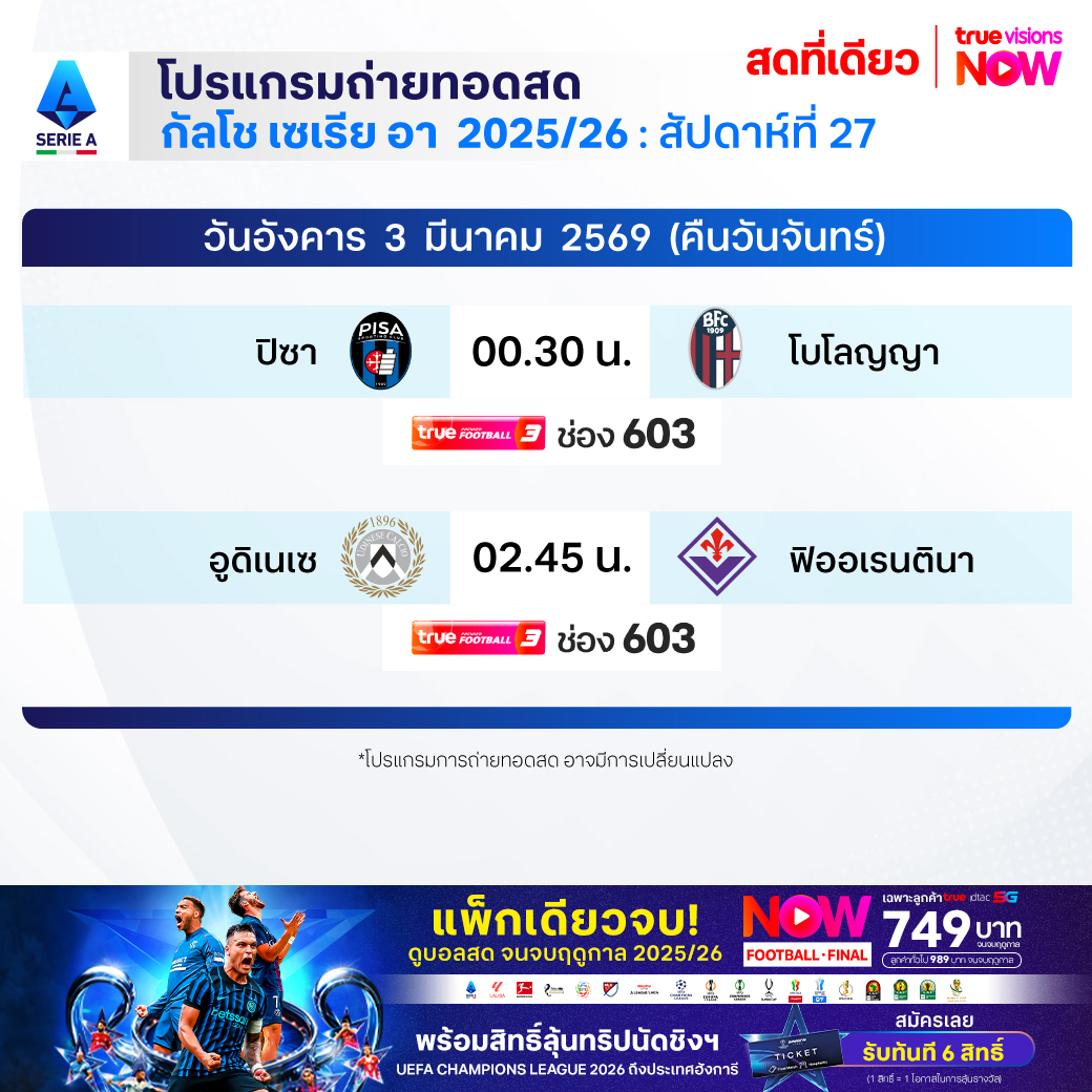 Udinese vs Fiorentina เวลา 02.45-04.45 ทางช่องTPF 3(603)