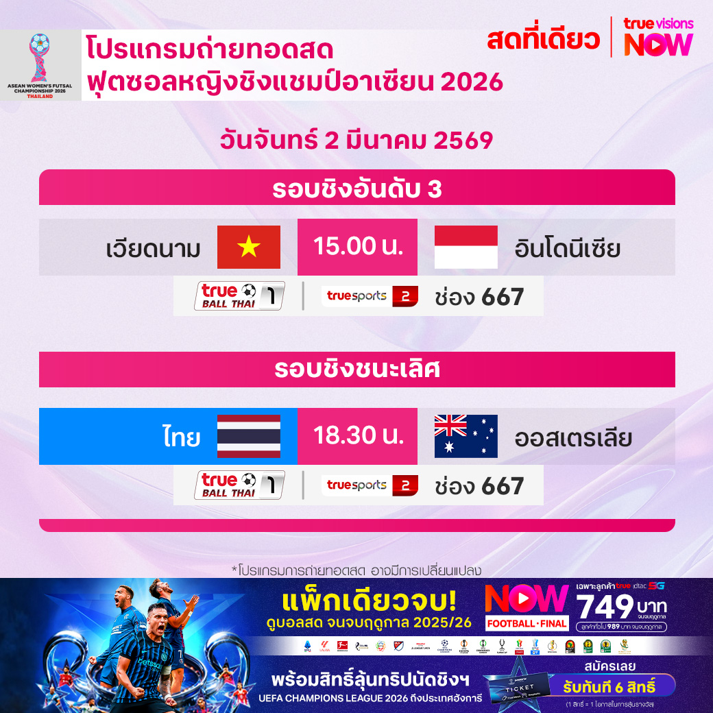 วันนี้มีอะไรดูที่ ทรูวิชั่นส์ ประจำวันจันทร์ที่ 2 มีนาคม 69 ยังคงมีกีฬาที่น่าสนใจให้ได้ตามลุ้นตามเชียร์กันเหมือนเดิม โดยในส่วนของฟุตบอลยังมีศึก ลา ลีกา สเปน และ กัลโช่ เซเรีย อา อิตาลี ให้ได้ตามเชียร์กันต่อ ส่วนกีฬาอื่นๆ มีกอล์ฟ ทูมอร์โรว์ กอล์ฟ ลีก, ฟุตซอลหญิงชิงแชมป์อาเซียน, มวยไทย ดิ อัลติเมท มวยไทย เอ็กซ์พีเรียนซ์ และ วอลเลย์บอล วี-ลีก งานนี้ ทรูวิชั่นส์ จัดเต็มให้ชมกันถึงบ้าน