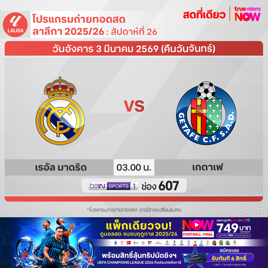 Real Madrid vs Getafe เวลา 03.00-05.00 ทางช่อง beIN 1 (607)