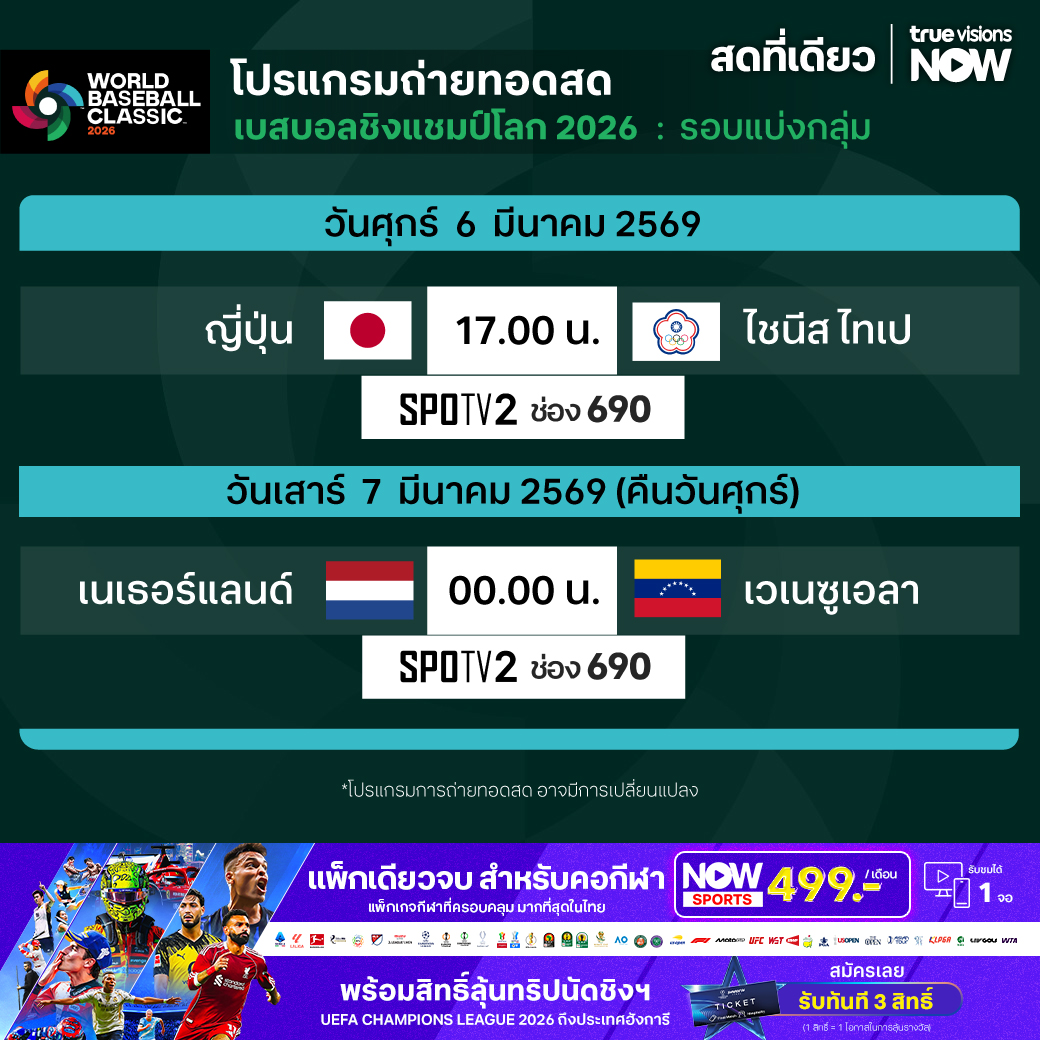 วันนี้มีอะไรดูที่ ทรูวิชั่นส์ ประจำวันศุกร์ที่ 6 มีนาคม 69 ยังคงมีกีฬาที่น่าสนใจให้ได้ตามลุ้นตามเชียร์กันเหมือนเดิม โดยในส่วนของฟุตบอลยังมีศึก ลา ลีกา สเปน, บุนเดสลีกา เยอรมนี, กัลโช่ เซเรีย อา อิตาลี, ลีกา 2 เยอรมนี และ ซาอุดิ โปร ลีก ให้ได้ตามเชียร์กันต่อ ส่วนกีฬาอื่นๆ คอมอเตอร์สปอร์ตพลาดไม่ได้กับศึก ฟอร์มูล่า วัน สนามแรกของฤดูกาล 2026 รายการ ออสเตรเลียน กรังด์ปรีซ์ รวมถึง ฟอร์มูล่า 2 / 3 แชมเปี้ยนชิพ นอกจากนี้ยังมี เทนนิสหญิง ดับเบิ้ลยูทีเอ ทัวร์ รายการ อินเดียน เวลส์ โอเพ่น, ลิฟ กอล์ฟ ฮ่องกง, แบดมินตัน บีดับเบิ้ลยูเอฟ รายการ ออล อิงแลนด์ โอเพ่น, รักบี้ ซิกซ์ เนชั่นส์, เบสบอลชิงแชมป์โลก, มวยไทย ดิ อัลติเมท มวยไทย เอ็กซ์พีเรียนซ์ และ วอลเลย์บอล วี-ลีก งานนี้ ทรูวิชั่นส์ จัดเต็มให้ชมกันถึงบ้าน