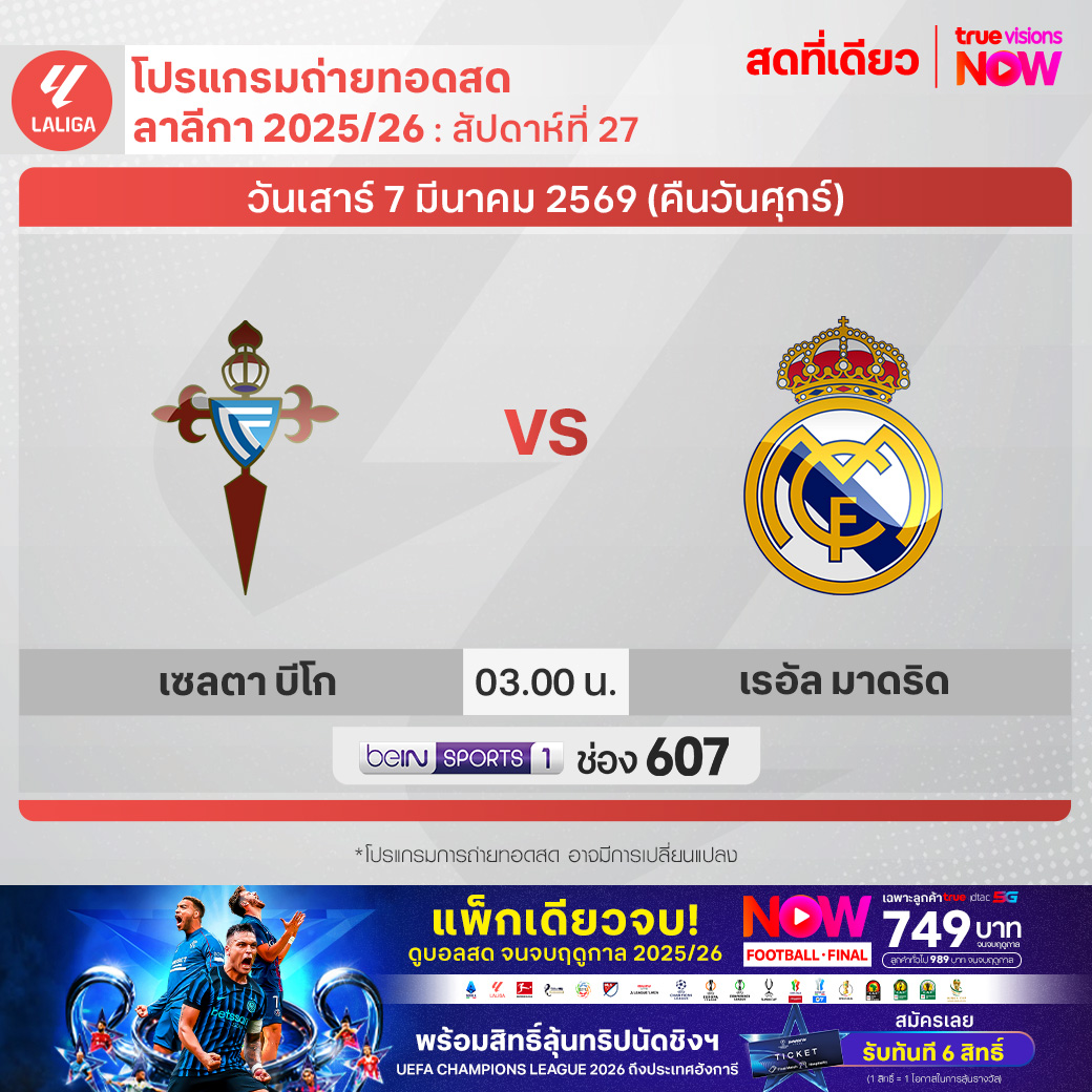Celta Vigo vs Real Madrid เวลา 03.00-05.00 ทางช่อง beIN 1 (607)