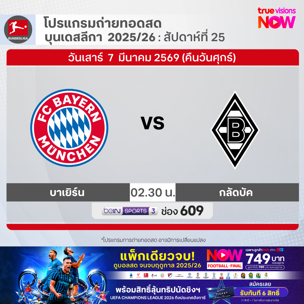 Bayern vs Monchengladbach เวลา 02.30-04.30 ทางช่อง beIN 3 (609)
