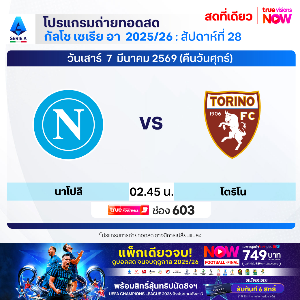 Napoli vs Torino เวลา 02.45-04.45 ทางช่องTPF 3(603)