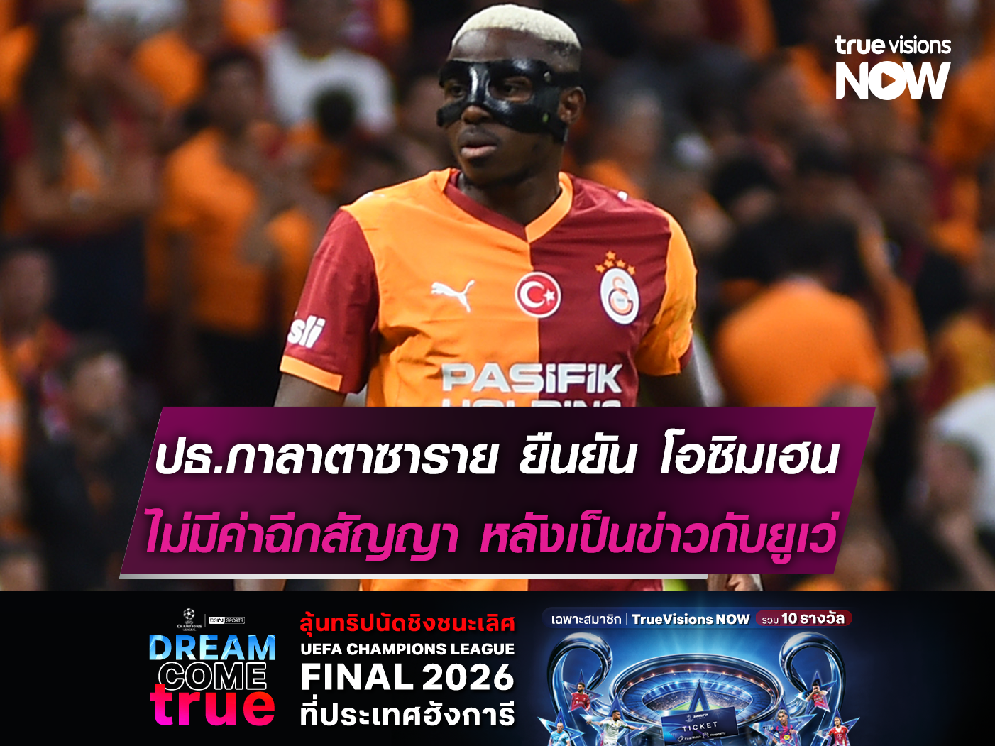 ดุร์ซุน ออซเบค ประธานสโมสรกาลาตาซาราย ออกมายืนยันผ่าน Fanatik สื่อในประเทศตุรกี ว่าทีมไม่ได้ใส่เงื่อนไขค่าฉีกสัญญาของ วิคเตอร์ โอซิมเฮน กองหน้าตัวเก่ง หลังตกเป็นข่าวกับยูเวนตุส