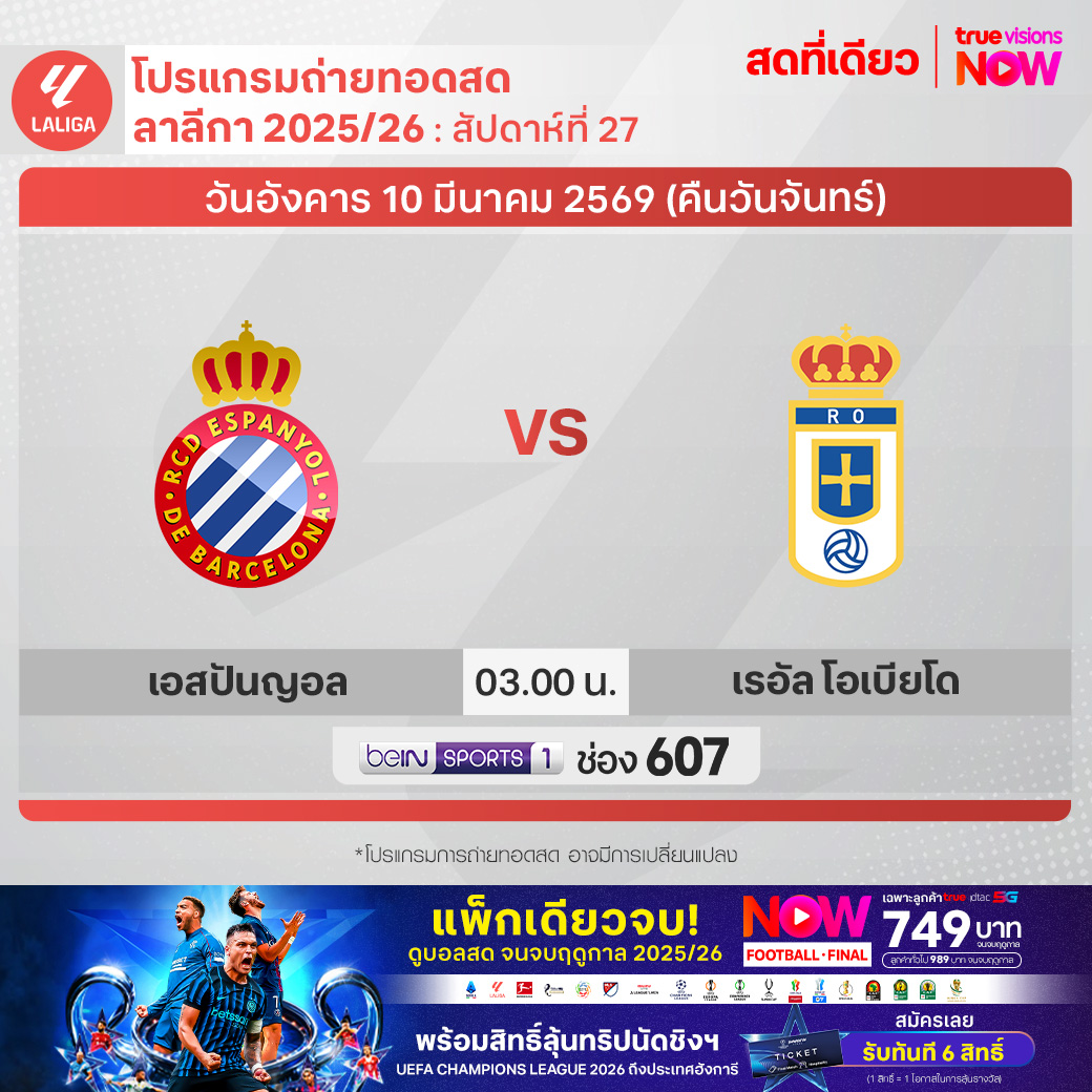 Espanyol vs Real Oviedo เวลา 03.00-05.00 ทางช่อง beIN 1 (607)