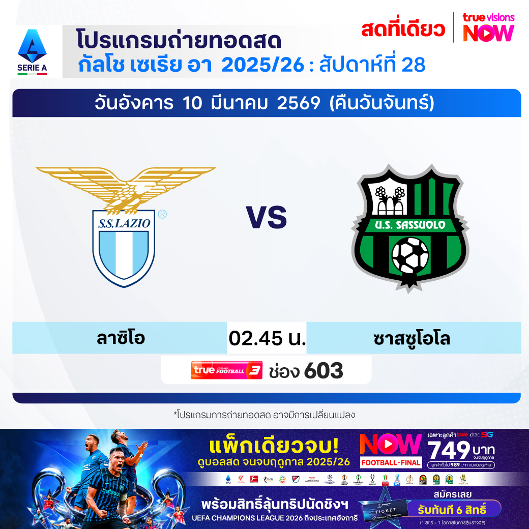 Lazio vs Sassuolo เวลา 02.45-04.45 ทางช่องTPF 3(603)