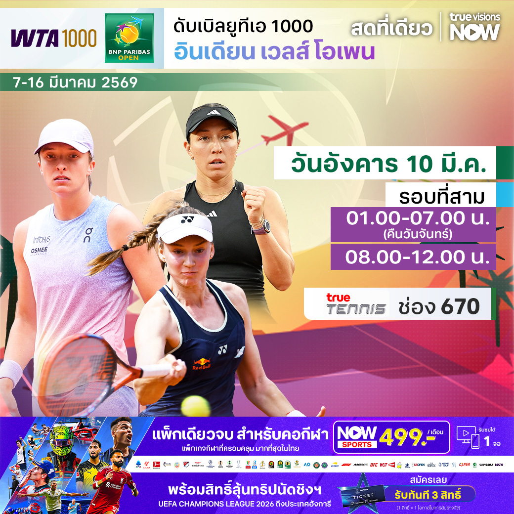 เทนนิสหญิง ดับเบิ้ลยูทีเอ ทัวร์ เข้าสู่เดือนมีนาคม เดือนที่มีรายการใหญ่แข่งติดต่อกัน 2 รายการ หรือที่เรียกว่าช่วง Sunshine Double สัปดาห์นี้พบกับรายการระดับ WTA 1000 อินเดียน เวลส์ โอเพ่น เทนนิสรายการใหญ่ที่มีคำนิยามว่าเป็น "แกรนด์สแลมที่ 5 ของปี" บรรดานักเทนนิสชื่อดังต่างตบเท้าเข้าร่วมการแข่งขันกันอย่างครบครัน นำโดย อารีนา ซาบาเลนก้า, โคโค กอฟ์ฟ, เอรินา ริบาคินา และ อิกา ซิออนเทค ร่วมลุ้นกันว่าใครจะคว้าแชมป์รายการที่ยิ่งใหญ่นี้ไปครอง ชมสด ครบทุกรอบ ที่ ทรูวิชั่นส์