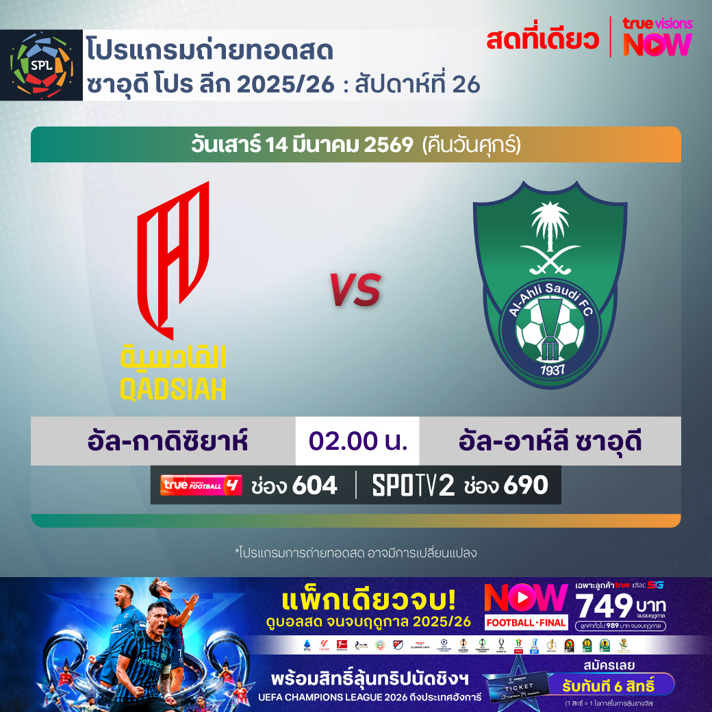 Al Qadsiah vs Al Ahli เวลา 02.00-04.00 ทางช่องTPF 4(604) / SPOTV2 (690)