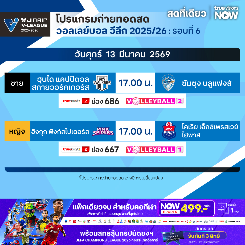 ฮุนได แคปปิตอล สกายวอร์คเกอร์ส พบ ซัมซุง บลูแฟงส์ เวลา 17.00 ทางช่อง TS 7 (686) / Volleyball 2