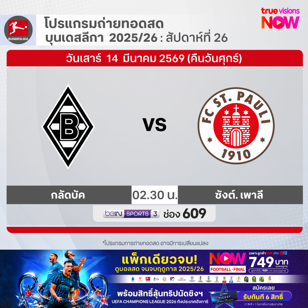 Monchengladbach vs St. Pauli เวลา 02.30-04.30 ทางช่อง beIN 3 (609)