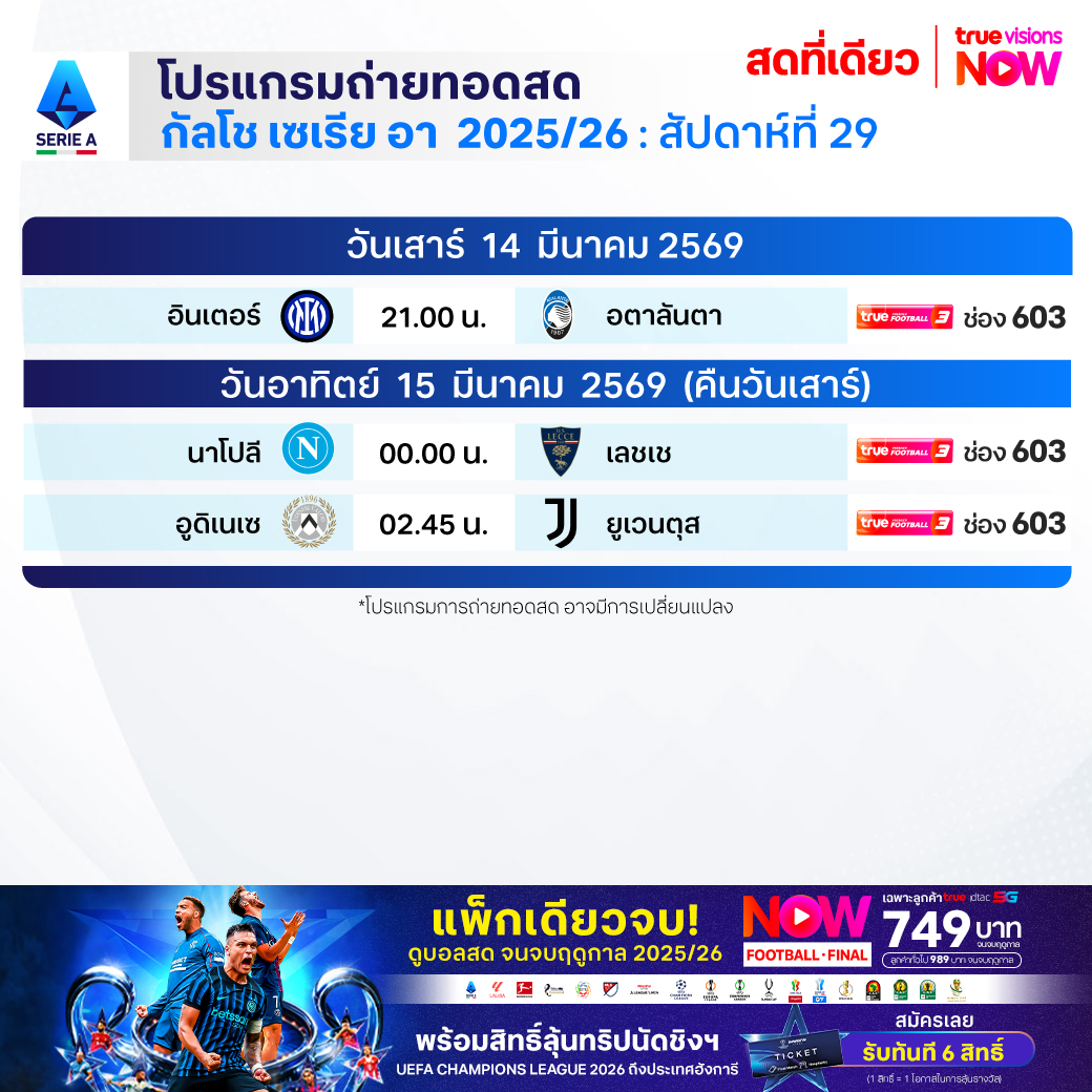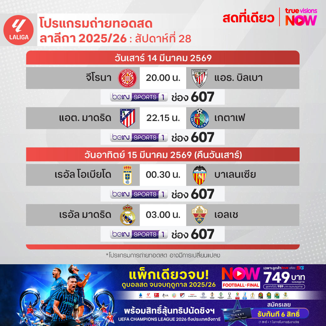 วันนี้มีอะไรดูที่ ทรูวิชั่นส์ ประจำวันเสาร์ที่ 14 มีนาคม 69 ยังคงมีกีฬาที่น่าสนใจให้ได้ตามลุ้นตามเชียร์กันเหมือนเดิม โดยในส่วนของฟุตบอลยังมีศึก ลา ลีกา สเปน, บุนเดสลีกา เยอรมนี, กัลโช่ เซเรีย อา อิตาลี, สกอตติช พรีเมียร์ชิพ และ ซาอุดิ โปร ลีก ให้ได้ตามเชียร์กันต่อ ส่วนกีฬาอื่นๆ คอมอเตอร์สปอร์ตพลาดไม่ได้กับศึก ฟอร์มูล่า วัน 2026 รายการ ไชนีส กรังด์ปรีซ์ นอกจากนี้ยังมี ลิฟ กอล์ฟ สิงคโปร์, กอล์ฟหญิง เลดี้ส์ ยูโรเปี้ยน ทัวร์ รายการ วีเมนส์ ออสเตรเลียน โอเพ่น, เคแอลพีจีเอ รายการ รีจูรัน แชมเปี้ยนชิพ, แบดมินตัน บีดับเบิ้ลยูเอฟ รายการ สวิส โอเพ่น, ยูเอฟซี ไฟต์ ไนท์, รักบี้ ซิกซ์ เนชั่นส์, มวยไทย ดิ อัลติเมท มวยไทย เอ็กซ์พีเรียนซ์, วอลเลย์บอล วี-ลีก และ วอลเลย์บอล ไทยแลนด์ ลีก งานนี้ ทรูวิชั่นส์ จัดเต็มให้ชมกันถึงบ้าน