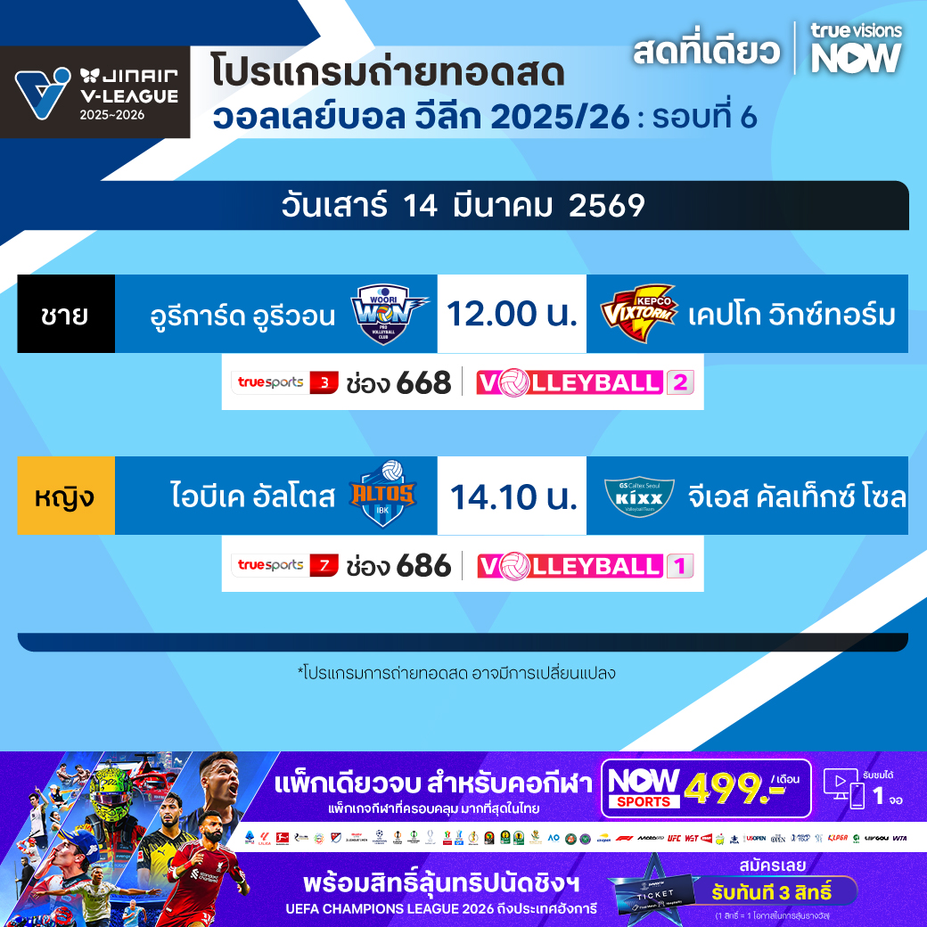 อูรีการ์ด อูรีวอน พบ เคปโก วิกซ์ทอร์ม เวลา 12.00 ทางช่อง TS 3 (668) / Volleyball 2