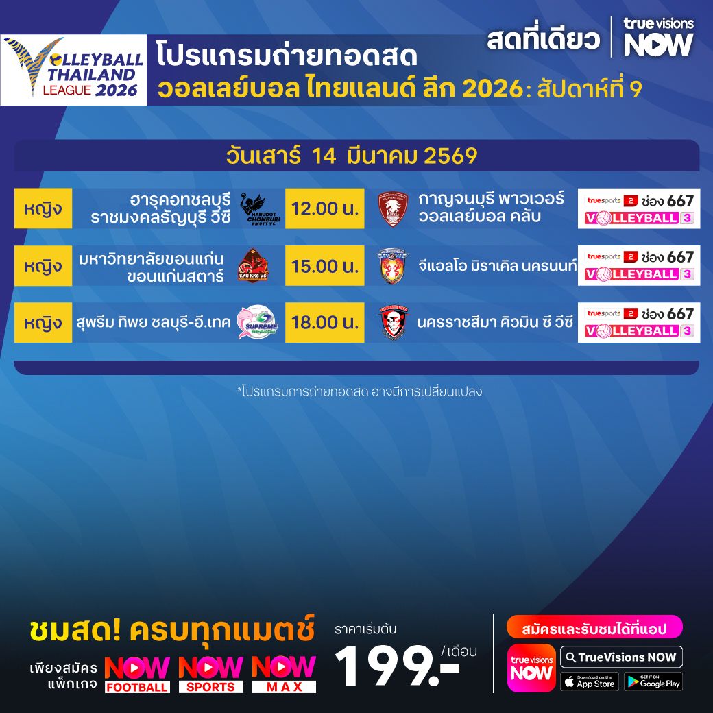 ฮารุคอทชลบุรี ราชมงคลธัญบุรี วีซี พบ กาญจนบุรี พาวเวอร์ วอลเลย์บอล คลับ เวลา 12.00 ทางช่อง TS 2 (667) / Volleyball 3