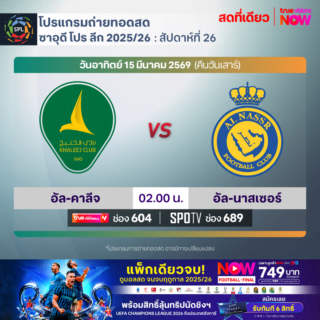 Al Khaleej vs Al Nassr เวลา 02.00-04.00 ทางช่องTPF 4(604) / SPOTV (689)