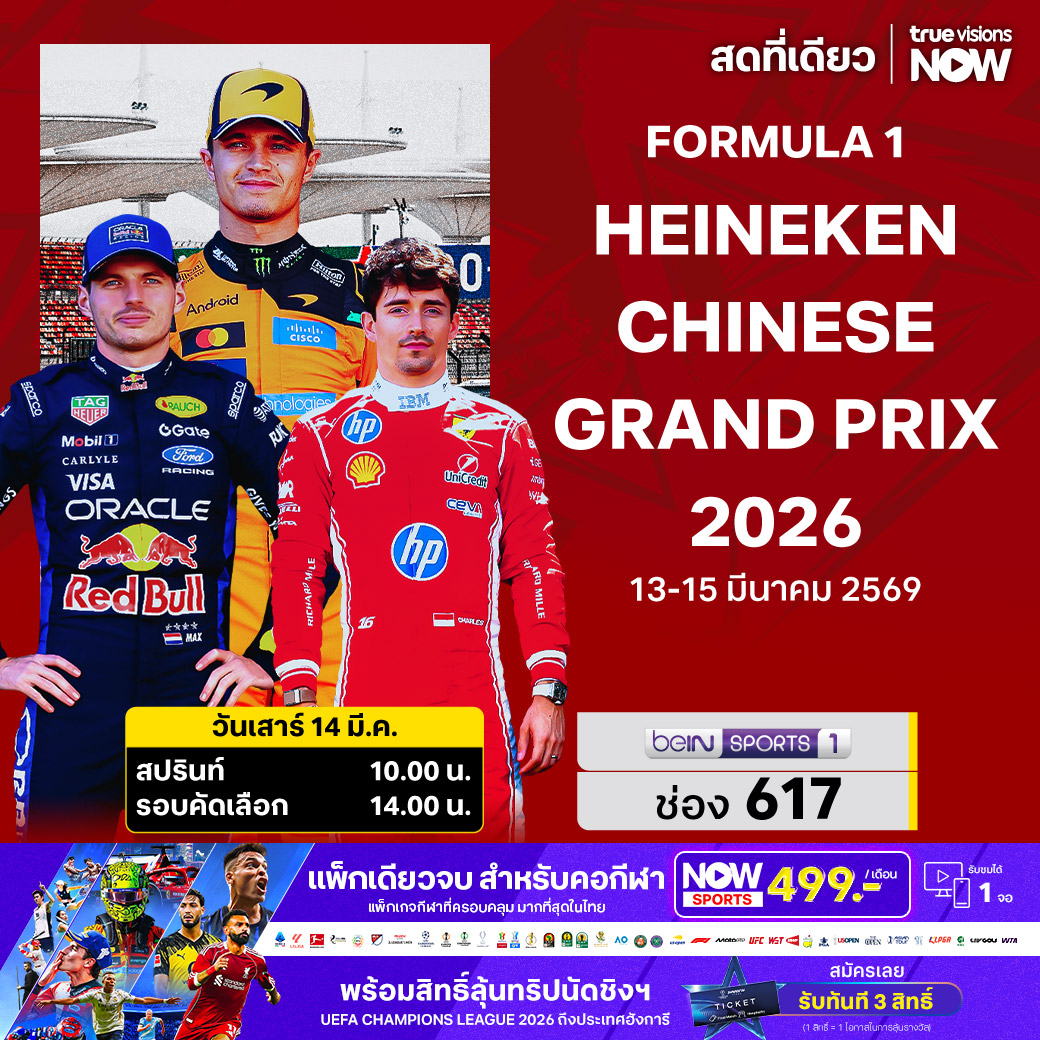 ศึก ฟอร์มูล่า วัน ฤดูกาล 2026 สัปดาห์นี้ ติดตามกันต่อกับความสนุกตื่นเต้นจากเรซที่ 2 รายการ ไชนีส กรังด์ปรีซ์ ที่สนามเซี่ยงไฮ้ อินเตอร์เนขั่นแนล เซอร์กิต นครเซี่ยงไฮ้ ประเทศจีน จับตาดูทีมหัวแถวระดับเต็งแชมป์ แม็คลาเรน, เฟอร์รารี่, เมอร์เซเดส รวมไปถึง เร้ดบูลล์ ทีมใดจะทำได้ดีกว่ากัน ชมสด ครบทุกช่วงการแข่งขัน ที่ ทรูวิชั่นส์
