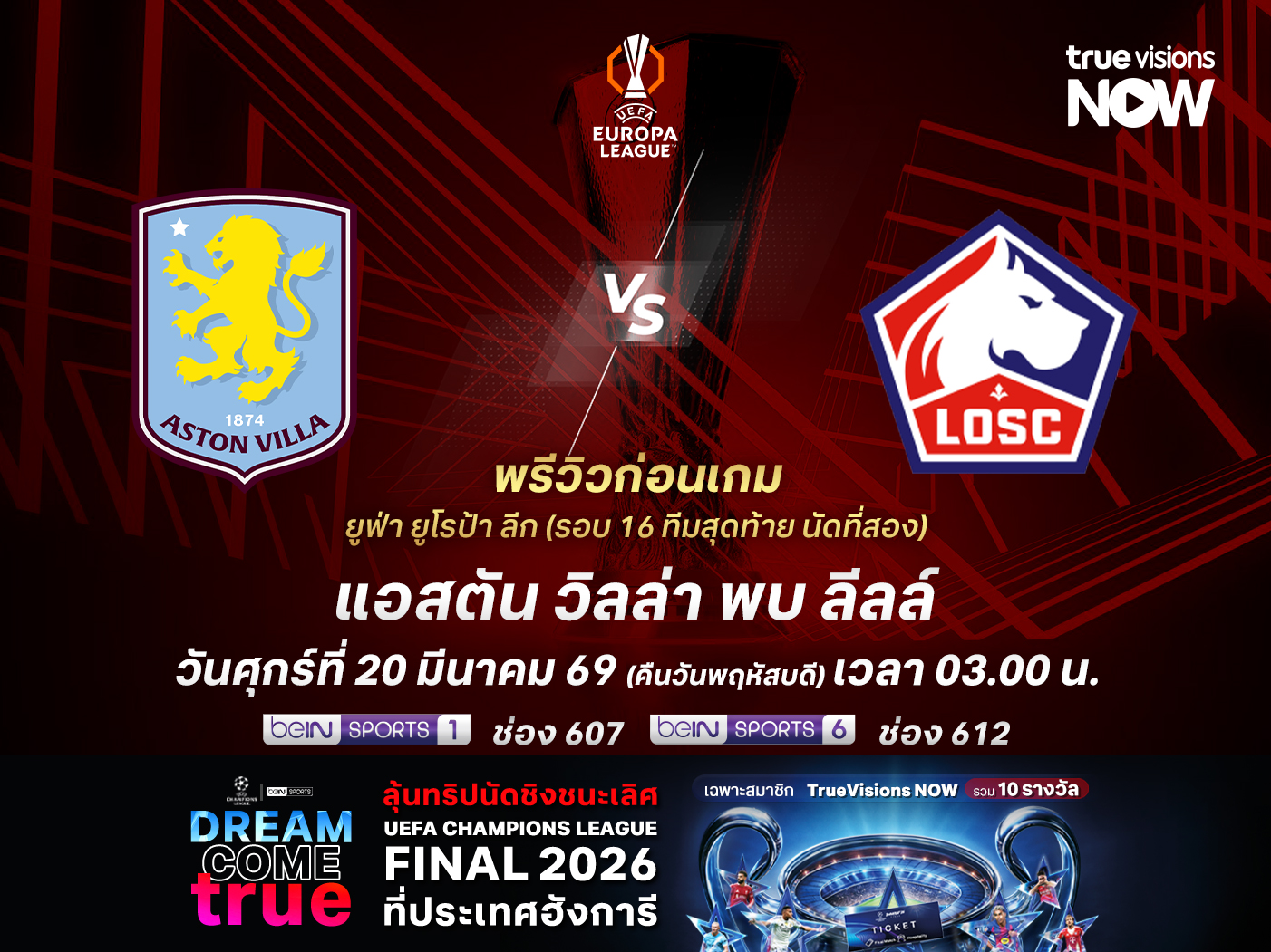 ศึก ยูฟ่า ยูโรป้า ลีก 2025-26 รอบ 16 ทีมสุดท้าย นัดที่สอง แอสตัน วิลล่า จากอังกฤษ จะเล่นที่ วิลล่า พาร์ค รับการมาเยือนของ ลีลล์ จากฝรั่งเศส โดยเกมนี้ วิลล่า เจ้าถิ่น ฟอร์มในภาพรวมช่วงหลังถือว่าไม่ดีเอามากๆ เพราะไม่ชนะในพรีเมียร์ลีกมา 4 เกมติดแล้ว แถมยังแพ้ไปถึง 3 เกม แต่ใน ยูโรป้า ลีก พวกเขายังยอดเยี่ยม เพราะเล่นมาตั้งแต่รอบแรกรวม 9 นัด มี่สถิติชนะ 8 แพ้ 1 ขณะที่ ลีลล์ ฟอร์มดีมากในช่วงที่ผ่านมา แต่การแพ้เกมแรกมาก่อนทำให้นัดนี้เล่นได้ค่อนข้างลำบาก และมีโอกาสสูงที่จะโดนย้ำแค้นไปอีกครั้ง