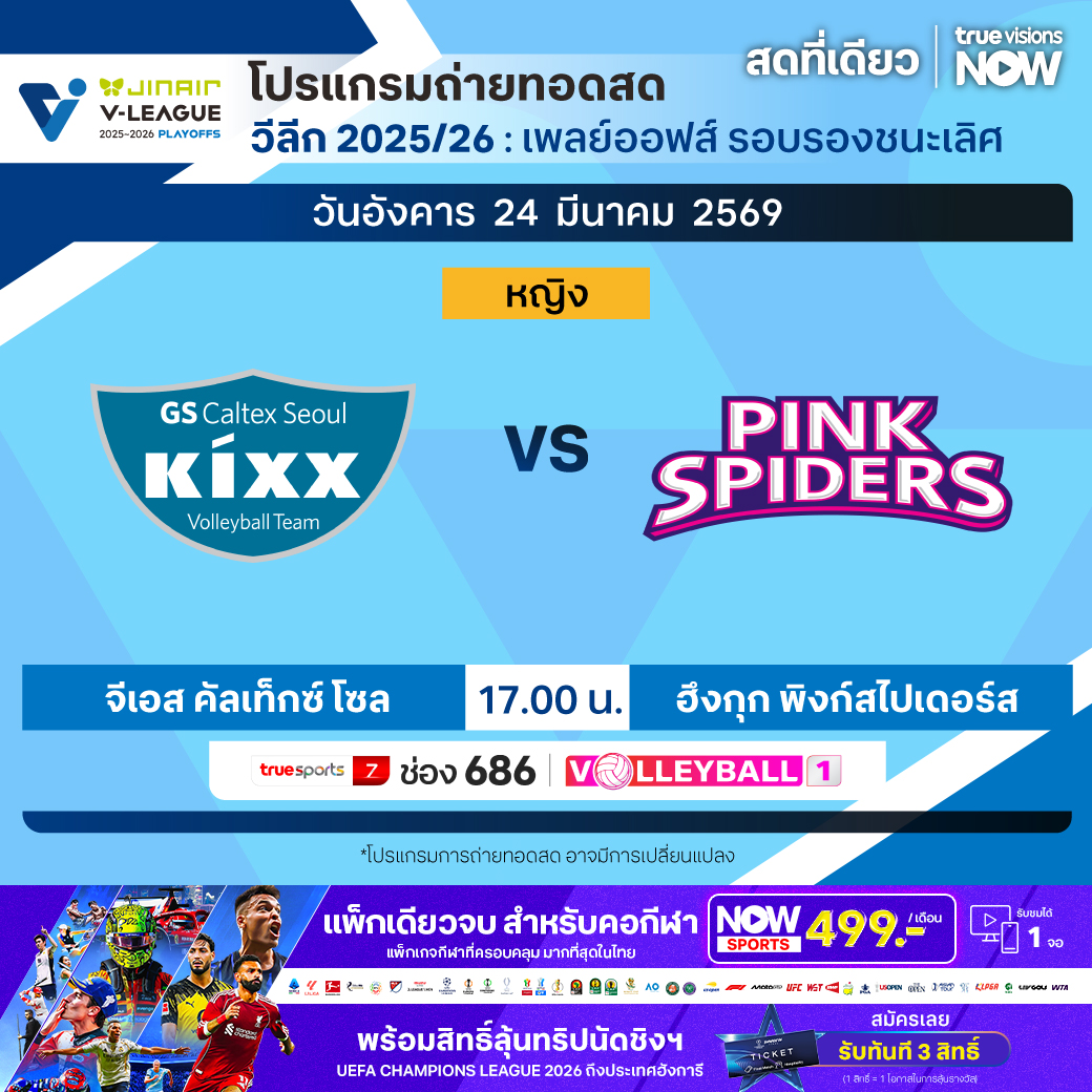 จีเอส คัลเท็กซ์ โซล ฮึงกุก พิงก์สไปเดอร์ส เวลา 17.00 ทางช่อง TS 7 (686) / Volleyball 1