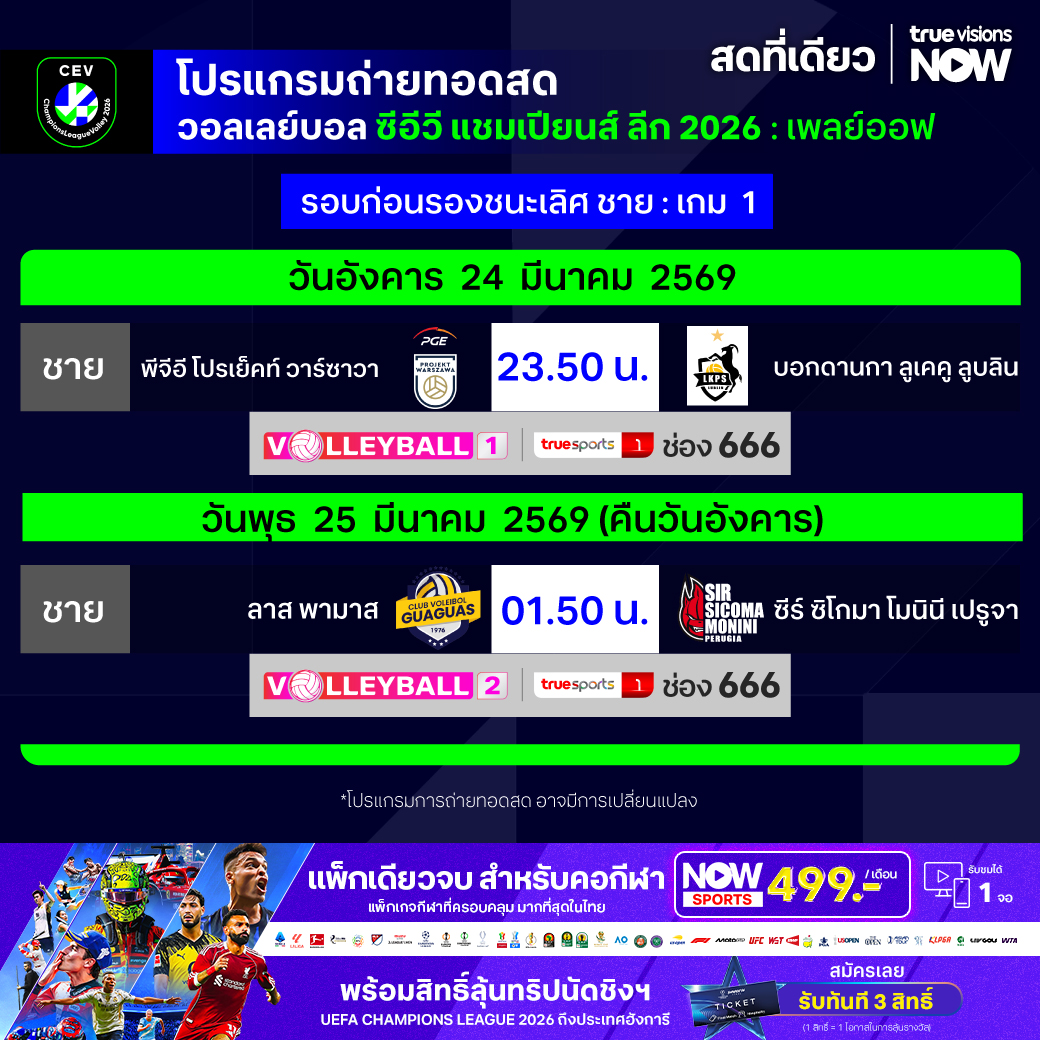 ลาส พามาส พบ ซีร์ ซิโกมา โมนินี เปรูจา เวลา 01.50 ทางช่อง Volleyball 2/TS 1 (666)