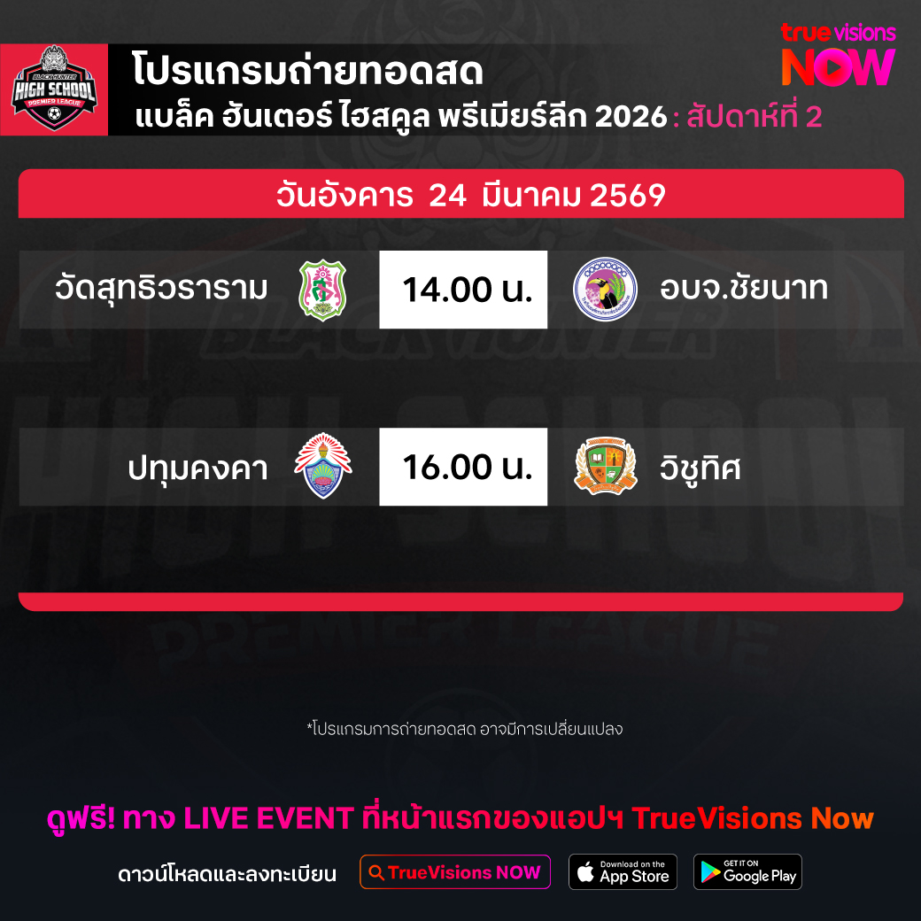 วันนี้มีอะไรดูที่ ทรูวิชั่นส์ ประจำวันอังคารที่ 24 มีนาคม 69 ยังคงมีกีฬาที่น่าสนใจให้ได้ตามลุ้นตามเชียร์กันเหมือนเดิม โดยในส่วนของฟุตบอลยังมี ฟุตบอลนักเรียน แบล็ค ฮันเตอร์ ไฮสคูล พรีเมียร์ลีก ให้ได้ตามเชียร์กันต่อ ส่วนกีฬาอื่นๆ ยังมีเทนนิสหญิง ดับเบิ้ลยูทีเอ ทัวร์ รายการ ไมอามี่ โอเพ่น, กอล์ฟ ทูมอร์โรว์ กอล์ฟ ลีก ไฟนอลส์, มวยไทย ดิ อัลติเมท มวยไทย เอ็กซ์พีเรียนซ์, วอลเลย์บอล ซีอีวี แชมเปี้ยนส์ ลีก และ วอลเลย์บอล วี-ลีก งานนี้ ทรูวิชั่นส์ จัดเต็มให้ชมกันถึงบ้าน