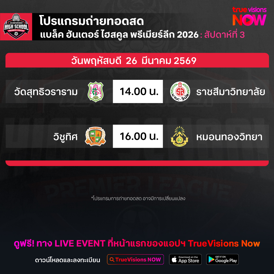 วันนี้มีอะไรดูที่ ทรูวิชั่นส์ ประจำวันพฤหัสบดีที่ 26 มีนาคม 69 ยังคงมีกีฬาที่น่าสนใจให้ได้ตามลุ้นตามเชียร์กันเหมือนเดิม โดยในส่วนของฟุตบอลยังมีฟุตบอลนักเรียน แบล็ค ฮันเตอร์ ไฮสคูล พรีเมียร์ลีก ให้ได้ตามเชียร์กันต่อ ส่วนกีฬาอื่นๆ ยังมีเทนนิสหญิง ดับเบิ้ลยูทีเอ ทัวร์ รายการ ไมอามี่ โอเพ่น, เมเจอร์ ลีก เบสบอล 2026 และ มวยไทย ดิ อัลติเมท มวยไทย เอ็กซ์พีเรียนซ์ งานนี้ ทรูวิชั่นส์ จัดเต็มให้ชมกันถึงบ้าน