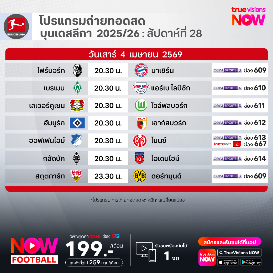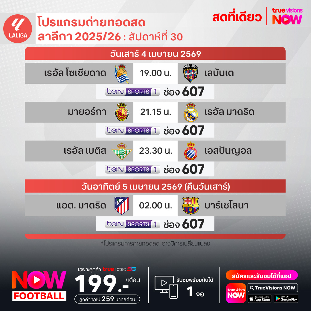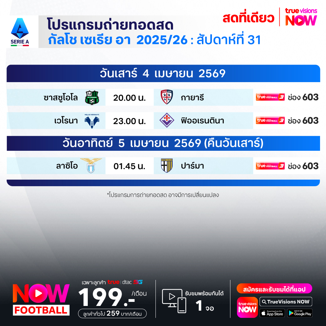วันนี้มีอะไรดูที่ ทรูวิชั่นส์ ประจำวันเสาร์ที่ 4 เมษายน 69 ยังคงมีกีฬาที่น่าสนใจให้ได้ตามลุ้นตามเชียร์กันเหมือนเดิม โดยในส่วนของฟุตบอลยังมี ลา ลีกา สเปน, บุนเดสลีกา เยอรมนี, กัลโช่ เซเรีย อา อิตาลี, เอ-ลีก ออสเตรเลีย, ซาอุดิ โปร ลีก และ ฟุตบอลนักเรียน แบล็ก ฮันเตอร์ ไฮสคูล พรีเมียร์ลีก ให้ได้ตามเชียร์กันต่อ ส่วนกีฬาอื่นๆ ยังมี เทนนิสหญิง ดับเบิ้ลยูทีเอ ทัวร์ รายการ ชาร์ลสตัน โอเพ่น, กอล์ฟ เอเชียนทัวร์ รายการ อินเตอร์เนชั่นแนล ซีรี่ส์ แจแปน, เลดี้ส์ ยูโรเปี้ยน ทัวร์ รายการ อารัมโก้ แชมเปี้ยนชิพ, เคแอลพีจีเอ ทัวร์ รายการ เดอะ ซีน่า โอเพ่น, เวิลด์ สนุกเกอร์ ทัวร์ รายการ ทัวร์ แชมเปี้ยนชิพ, เมเจอร์ ลีก เบสบอล, พิคเคิลบอล ฮานอย คัพ, ยูเอฟซี ไฟต์ ไนท์, มวยไทย ดิ อัลติเมท มวยไทย เอ็กซ์พีเรียนซ์, วอลเลย์บอล วี-ลีก และ วอลเลย์บอล ไทยแลนด์ ลีก งานนี้ ทรูวิชั่นส์ จัดเต็มให้ชมกันถึงบ้าน