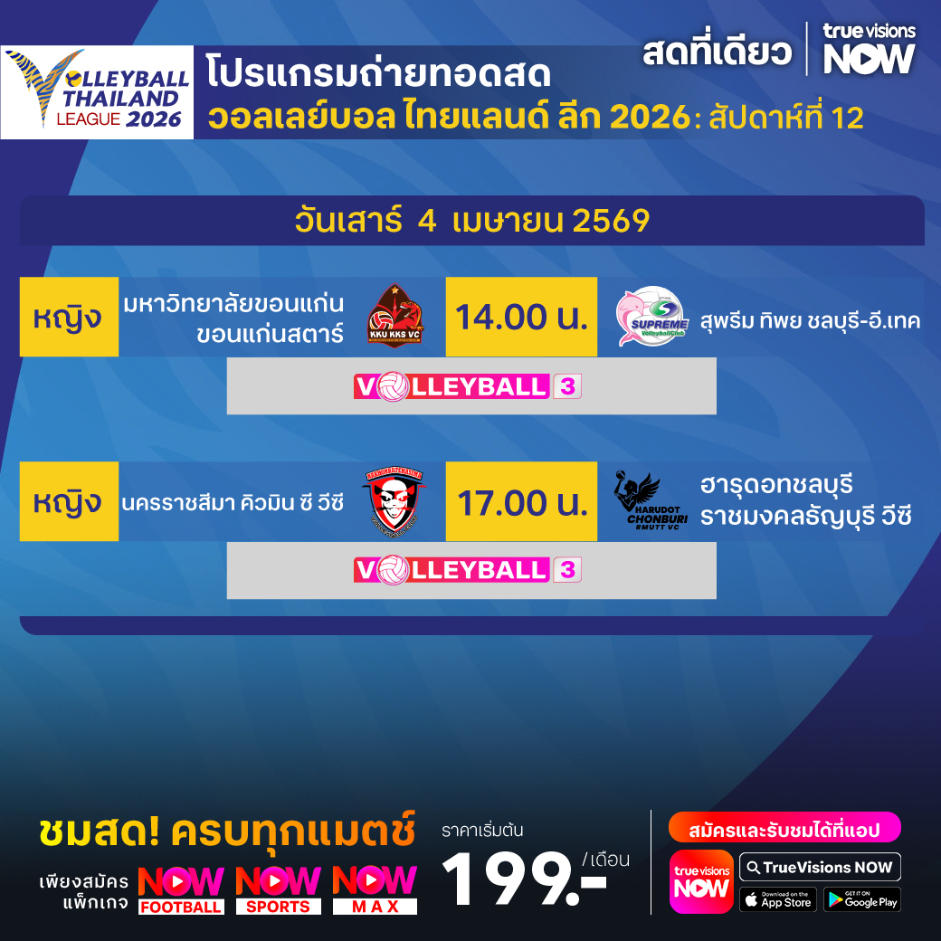 มหาวิทยาลัยขอนแก่น ขอนแก่นสตาร์ พบ สุพรีม ทิพย ชลบุรี-อี.เทค เวลา 14.00 ทางช่อง Volleyball 3