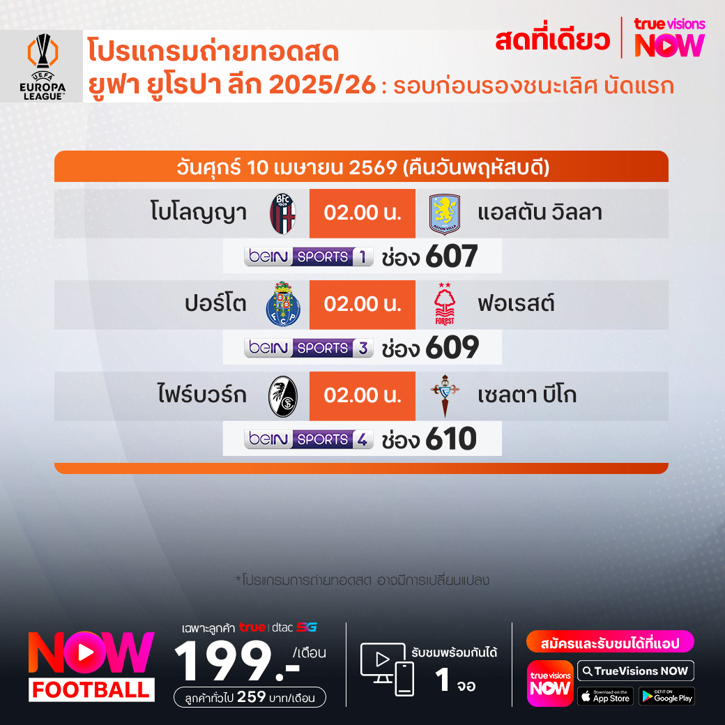 โบโลญญ่า พบ แอสตัน วิลล่า เวลา 02.00-04.00 ทางช่อง beIN 1 (607)
