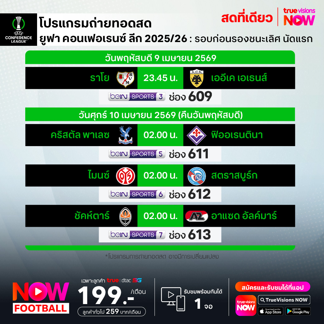 วันนี้มีอะไรดูที่ ทรูวิชั่นส์ ประจำวันพฤหัสบดีที่ 9 เมษายน 69 ยังคงมีกีฬาที่น่าสนใจให้ได้ตามลุ้นตามเชียร์กันเหมือนเดิม โดยในส่วนของฟุตบอลยังมีศึก ยูฟ่า ยูโรป้า ลีก และ ยูฟ่า คอนเฟอเรนซ์ ลีก รอบก่อนรองชนะเลิศ นัดแรก และ ซาอุดิ โปร ลีก ให้ได้ตามเชียร์กันต่อ ส่วนกีฬาอื่นๆ ยังมี เทนนิสหญิง ดับเบิ้ลยูทีเอ ทัวร์ รายการ ออสเตรีย เลดี้ส์ ลินซ์, กอล์ฟ เดอะ มาสเตอร์ส ทัวร์นาเมนท์, เคแอลพีจีเอ ทัวร์ รายการ ไอเอ็ม ไฟแนนเชียล กรุ๊ป โอเพ่น, แบดมินตัน เอเชีย แชมเปี้ยนชิพ, เมเจอร์ ลีก เบสบอล และ มวยไทย ดิ อัลติเมท มวยไทย เอ็กซ์พีเรียนซ์ งานนี้ ทรูวิชั่นส์ จัดเต็มให้ชมกันถึงบ้าน