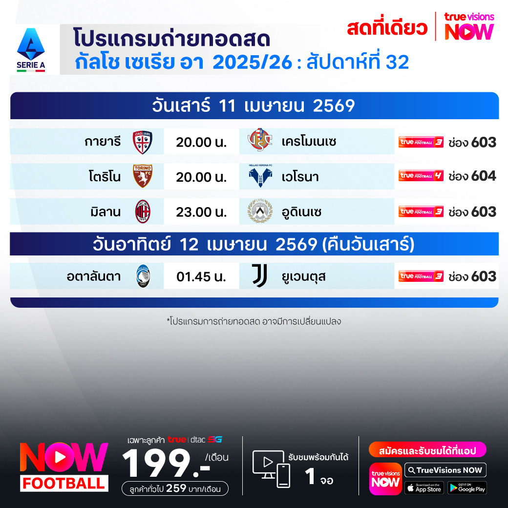 อตาลันต้า พบ ยูเวนตุส เวลา 01.45-03.45 ทางช่องTPF 3(603)