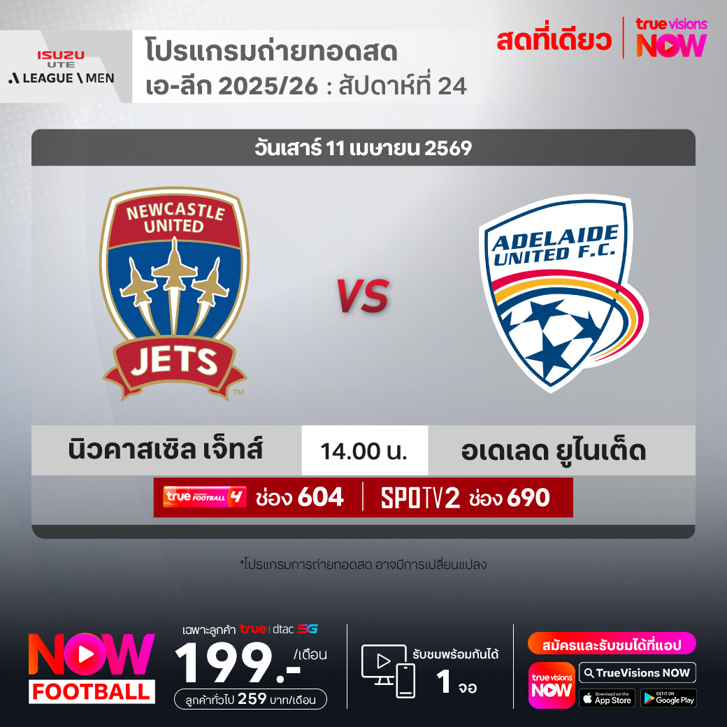 นิวคาสเซิล เจ็ทส์ พบ อเดเลด ยูไนเต็ด เวลา 14.00-16.00 ทางช่องTPF 4(604) / SPOTV2 (690)