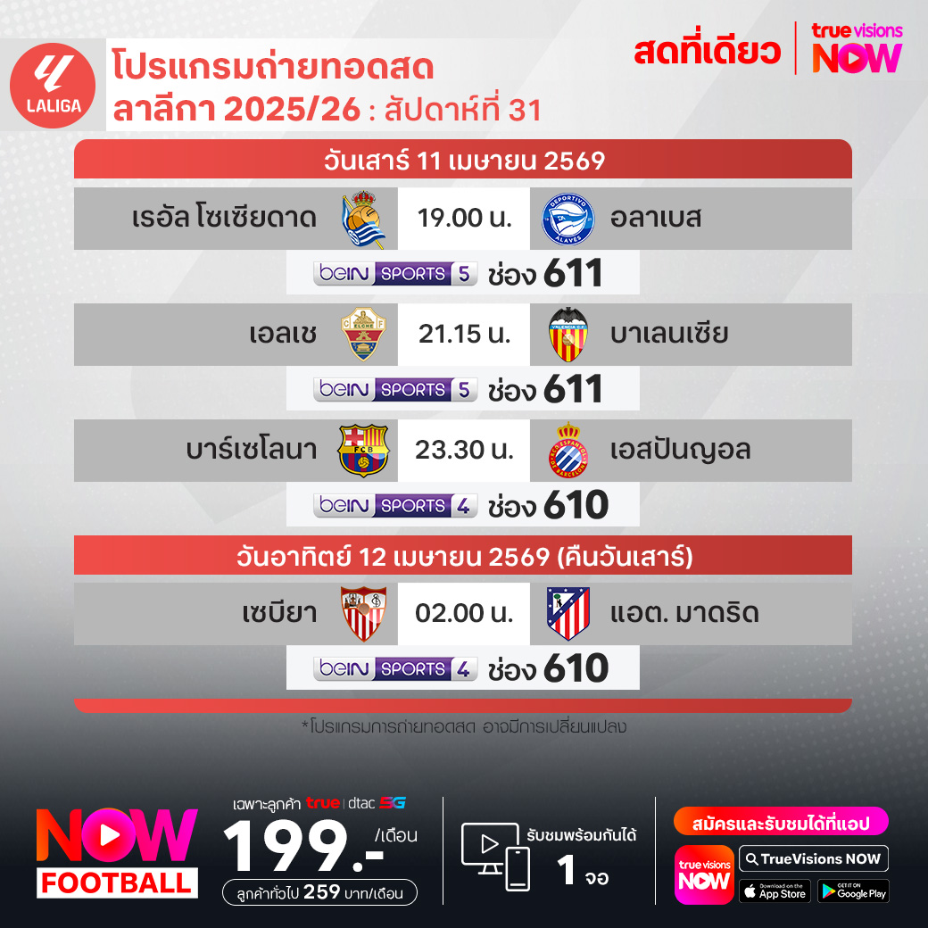 วันนี้มีอะไรดูที่ ทรูวิชั่นส์ ประจำวันเสาร์ที่ 11 เมษายน 69 ยังคงมีกีฬาที่น่าสนใจให้ได้ตามลุ้นตามเชียร์กันเหมือนเดิม โดยในส่วนของฟุตบอลยังมีศึก ลา ลีกา สเปน, บุนเดสลีกา เยอรมนี, กัลโช่ เซเรีย อา อิตาลี, เอ-ลีก ออสเตรเลีย และ ซาอุดิ โปร ลีก ให้ได้ตามเชียร์กันต่อ ส่วนกีฬาอื่นๆ ยังมี เทนนิสหญิง ดับเบิ้ลยูทีเอ ทัวร์ รายการ ออสเตรีย เลดี้ส์ ลินซ์, เทนนิสทีมหญิงชิงแชมป์โลก บิลลี่ จีน คิง คัพ ไฟนอลส์, กอล์ฟ เดอะ มาสเตอร์ส ทัวร์นาเมนท์, เคแอลพีจีเอ ทัวร์ รายการ ไอเอ็ม ไฟแนนเชียล กรุ๊ป โอเพ่น, แบดมินตัน เอเชีย แชมเปี้ยนชิพ และ ยูโรเปี้ยน แชมเปี้ยนชิพ, เมเจอร์ ลีก เบสบอล, ยูเอฟซี 327 และ มวยไทย ดิ อัลติเมท มวยไทย เอ็กซ์พีเรียนซ์ งานนี้ ทรูวิชั่นส์ จัดเต็มให้ชมกันถึงบ้าน