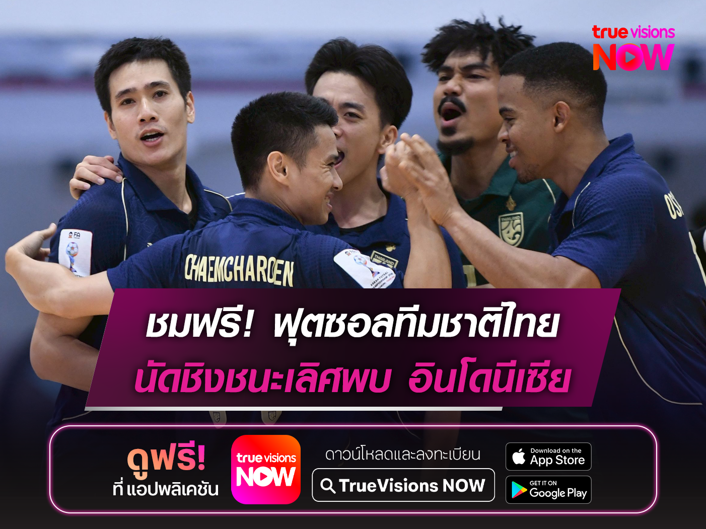 เช็กช่องทางรับชมถ่ายทอดสดฟุตซอลชิงแชมป์อาเซียน นัดชิงชนะเลิศ ระหว่าง ทีมชาติไทย พบ อินโดนีเซีย ลงสนามแข่งขันวันอาทิตย์ที่ 12 เมษายนนี้ เวลา 20.00 น. ถ่ายทอดสดให้รับชมฟรี! ทางแอปพลิเคชัน True Visions NOW ช่อง true BALL THAI 1 / truesports2 (667)