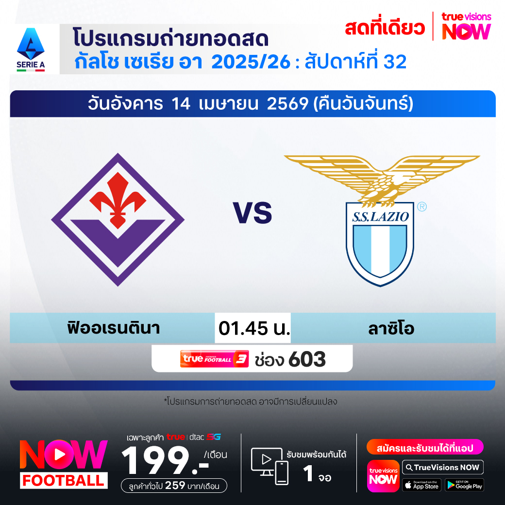 ฟิออเรนติน่า พบ ลาซิโอ เวลา 01.45-03.45 ทางช่องTPF 3(603)