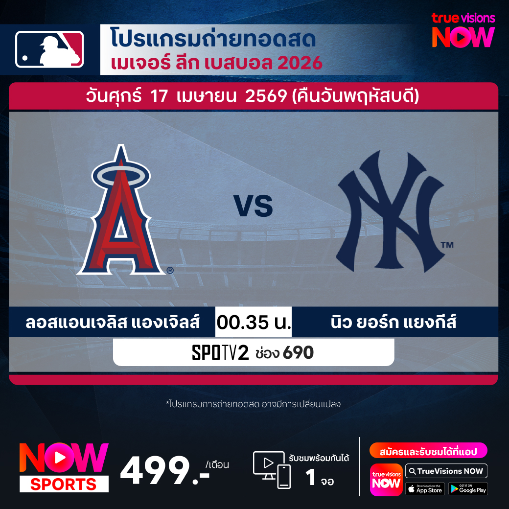 ลอสแอนเจลิส แองเจิลส์ พบ นิวยอร์ก แยงกีส์ เวลา 00.35 ทางช่อง SPOTV2 (690)
