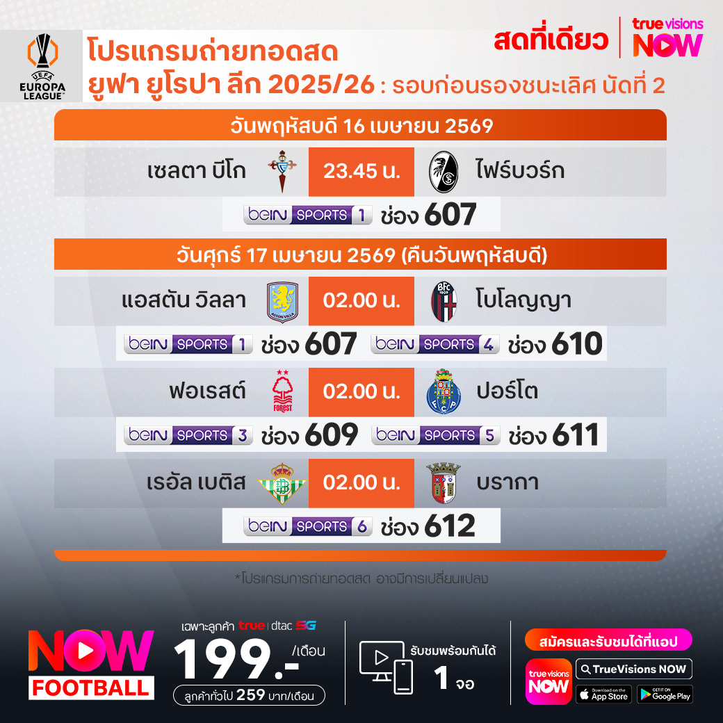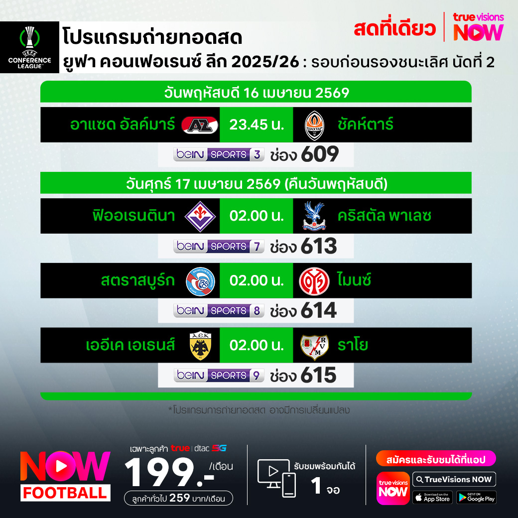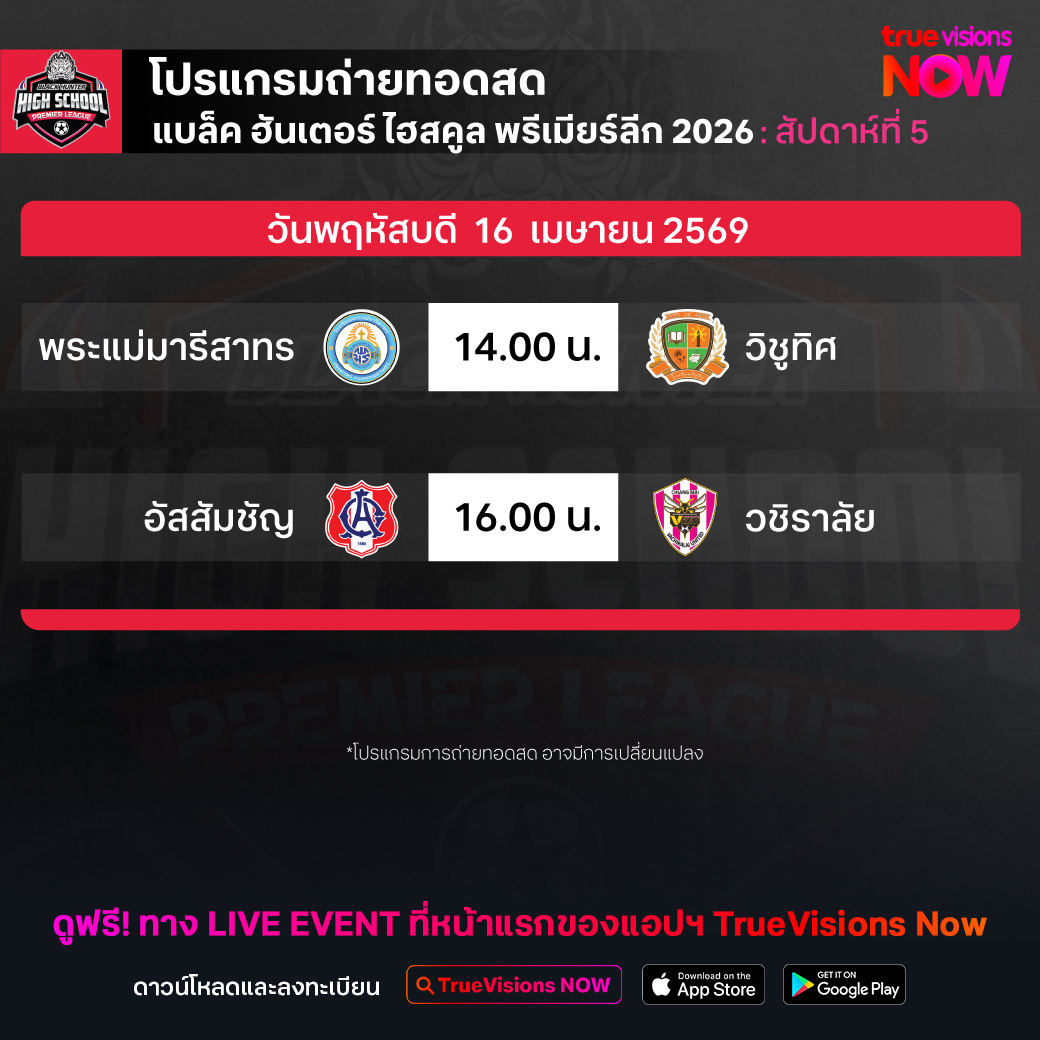 วันนี้มีอะไรดูที่ ทรูวิชั่นส์ ประจำวันพฤหัสบดีที่ 16 เมษายน 69 ยังคงมีกีฬาที่น่าสนใจให้ได้ตามลุ้นตามเชียร์กันเหมือนเดิม โดยในส่วนของฟุตบอลยังมีศึก ยูฟ่า ยูโรป้า ลีก และ ยูฟ่า คอนเฟอเรนซ์ ลีก รอบก่อนรองชนะเลิศ นัดที่สอง รวมถึง ฟุตบอลนักเรียน แบล็ค ฮันเตอร์ ไฮสคูล พรีเมียร์ลีก ให้ได้ตามเชียร์กันต่อ ส่วนกีฬาอื่นๆ ยังมี เทนนิสหญิง ดับเบิ้ลยูทีเอ ทัวร์ รายการ ปอร์เช่ เทนนิส กรังด์ปรีซ์, ลิฟ กอล์ฟ เม็กซิโก ซิตี้, เมเจอร์ ลีก เบสบอล และ มวยไทย ดิ อัลติเมท มวยไทย เอ็กซ์พีเรียนซ์ งานนี้ ทรูวิชั่นส์ จัดเต็มให้ชมกันถึงบ้าน