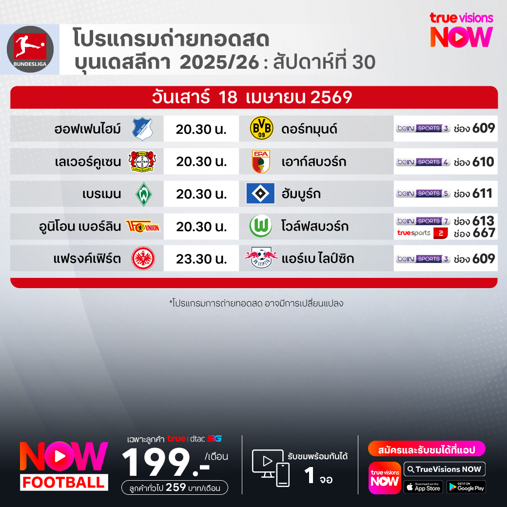 วันนี้มีอะไรดูที่ ทรูวิชั่นส์ ประจำวันเสาร์ที่ 18 เมษายน 69 ยังคงมีกีฬาที่น่าสนใจให้ได้ตามลุ้นตามเชียร์กันเหมือนเดิม โดยในส่วนของฟุตบอลยังมีศึก บุนเดสลีกา เยอรมนี และ กัลโช่ เซเรีย อา อิตาลี ให้ได้ตามเชียร์กันต่อ ส่วนกีฬาอื่นๆ ยังมี เทนนิสหญิง ดับเบิ้ลยูทีเอ ทัวร์ รายการ ปอร์เช่ เทนนิส กรังด์ปรีซ์, ลิฟ กอล์ฟ เม็กซิโก ซิตี้, เลดี้ส์ ยูโรเปี้ยน ทัวร์ รายการ โจเบิร์ก เลดี้ส์ โอเพ่น, เคแอลพีจีเอ ทัวร์ รายการ เน็กเซน เซนต์ ไนน์ มาสเตอร์ส, เวิลด์ สนุกเกอร์ ทัวร์ รายการ เวิลด์ แชมเปี้ยนชิพ, เมเจอร์ ลีก เบสบอล, ยูเอฟซี ไฟต์ ไนท์ และ มวยไทย ดิ อัลติเมท มวยไทย เอ็กซ์พีเรียนซ์ งานนี้ ทรูวิชั่นส์ จัดเต็มให้ชมกันถึงบ้าน