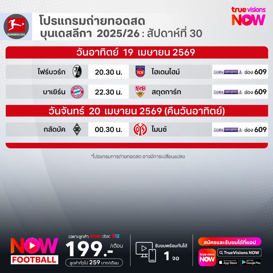 วันนี้มีอะไรดูที่ ทรูวิชั่นส์ ประจำวันอาทิตย์ที่ 19 เมษายน 69 ยังคงมีกีฬาที่น่าสนใจให้ได้ตามลุ้นตามเชียร์กันเหมือนเดิม โดยในส่วนของฟุตบอลยังมีศึก บุนเดสลีกา เยอรมนี, กัลโช่ เซเรีย อา อิตาลี, เอ-ลีก ออสเตรเลีย และ ฟุตบอลนักเรียน แบล็ค ฮันเตอร์ ไฮสคูล พรีเมียร์ลีก ให้ได้ตามเชียร์กันต่อ ส่วนกีฬาอื่นๆ ยังมี เทนนิสหญิง ดับเบิ้ลยูทีเอ ทัวร์ รายการ ปอร์เช่ เทนนิส กรังด์ปรีซ์, ลิฟ กอล์ฟ เม็กซิโก ซิตี้, เลดี้ส์ ยูโรเปี้ยน ทัวร์ รายการ โจเบิร์ก เลดี้ส์ โอเพ่น, เคแอลพีจีเอ ทัวร์ รายการ เน็กเซน เซนต์ ไนน์ มาสเตอร์ส, เวิลด์ สนุกเกอร์ ทัวร์ รายการ เวิลด์ แชมเปี้ยนชิพ, เมเจอร์ ลีก เบสบอล และ มวยไทย ดิ อัลติเมท มวยไทย เอ็กซ์พีเรียนซ์ งานนี้ ทรูวิชั่นส์ จัดเต็มให้ชมกันถึงบ้าน