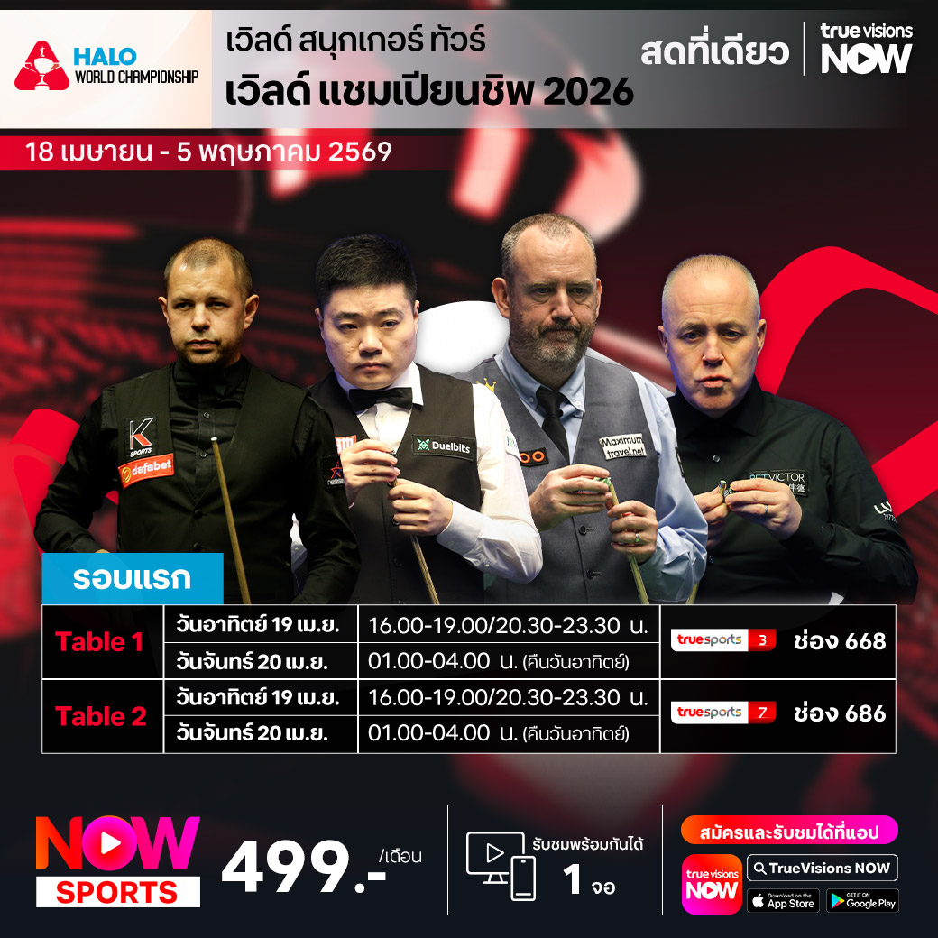 การรอคอยของแฟนๆ สิ้นสุดลงแล้ว เมื่อการแข่งขันที่ยิ่งใหญ่ที่สุดในประวัติศาสตร์ของกีฬาสนุกเกอร์ เดินทางมาถึง ครูซิเบิ้ล เธียเตอร์ ในเมืองเชฟฟิลด์ ประเทศอังกฤษ กับสนุกเกอร์ชิงแชมป์โลก หรือ เวิลด์ แชมเปี้ยนชิพ 2026 ที่จะเป็นการเปิดศึกของบรรดามือระดับสุดยอดของโลก โดยมีตำแหน่งแชมป์โลกเป็นเดิมพัน ร่วมสัมผัสประสบการณ์ที่สุดตื่นเต้น เร้าใจ เกมที่คู่คี่ สูสี ดวลคิวกันแบบมาราธอนใครนิ่ง ใครแม่น ใครจะผ่านความมกดดันระดับมหาศาลไปได้ ชมสด ครบทุกนาที ครบทุกแมตช์
