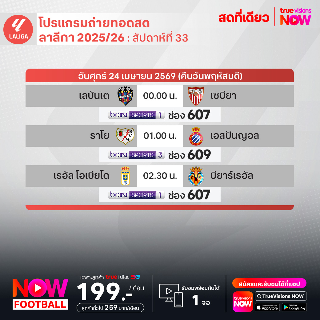 วันนี้มีอะไรดูที่ ทรูวิชั่นส์ ประจำวันพฤหัสบดีที่ 23 เมษายน 69 ยังคงมีกีฬาที่น่าสนใจให้ได้ตามลุ้นตามเชียร์กันเหมือนเดิม โดยในส่วนของฟุตบอลยังมีศึก ลา ลีกา สเปน, เดเอฟเบ โพคาล และ ฟุตบอลนักเรียน แบล็ค ฮันเตอร์ ไฮสคูล พรีเมียร์ลีก ให้ได้ตามเชียร์กันต่อ ส่วนกีฬาอื่นๆ ยังมี เทนนิสหญิง ดับเบิ้ลยูทีเอ ทัวร์ รายการ มาดริด โอเพ่น, กอล์ฟ เอเชียน ทัวร์ รายการ สิงคโปร์ โอเพ่น, เวิลด์ สนุกเกอร์ ทัวร์ รายการ เวิลด์ แชมเปี้ยนชิพ, เมเจอร์ ลีก เบสบอล และ มวยไทย ดิ อัลติเมท มวยไทย เอ็กซ์พีเรียนซ์ งานนี้ ทรูวิชั่นส์ จัดเต็มให้ชมกันถึงบ้าน