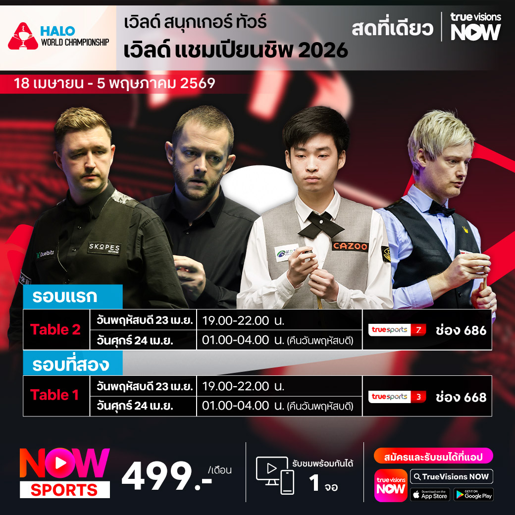 การรอคอยของแฟนๆ สิ้นสุดลงแล้ว เมื่อการแข่งขันที่ยิ่งใหญ่ที่สุดในประวัติศาสตร์ของกีฬาสนุกเกอร์ เดินทางมาถึง ครูซิเบิ้ล เธียเตอร์ ในเมืองเชฟฟิลด์ ประเทศอังกฤษ กับสนุกเกอร์ชิงแชมป์โลก หรือ เวิลด์ แชมเปี้ยนชิพ 2026 ที่จะเป็นการเปิดศึกของบรรดามือระดับสุดยอดของโลก โดยมีตำแหน่งแชมป์โลกเป็นเดิมพัน ร่วมสัมผัสประสบการณ์ที่สุดตื่นเต้น เร้าใจ เกมที่คู่คี่ สูสี ดวลคิวกันแบบมาราธอนใครนิ่ง ใครแม่น ใครจะผ่านความมกดดันระดับมหาศาลไปได้ ชมสด ครบทุกนาที ครบทุกแมตช์ ที่ ทรูวิชั่นส์