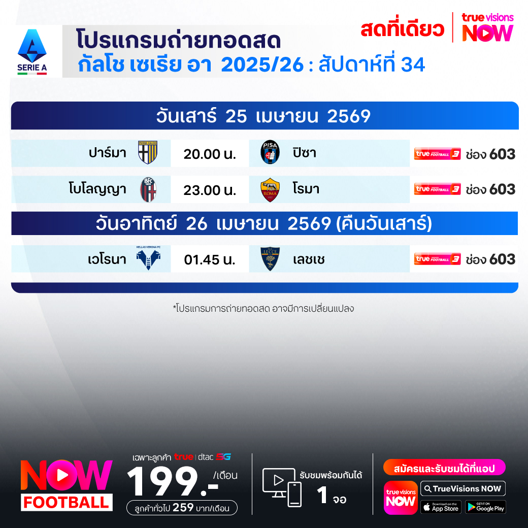 โบโลญญ่า พบ โรม่า เวลา 23.00-01.00 ทางช่องTPF 3(603)