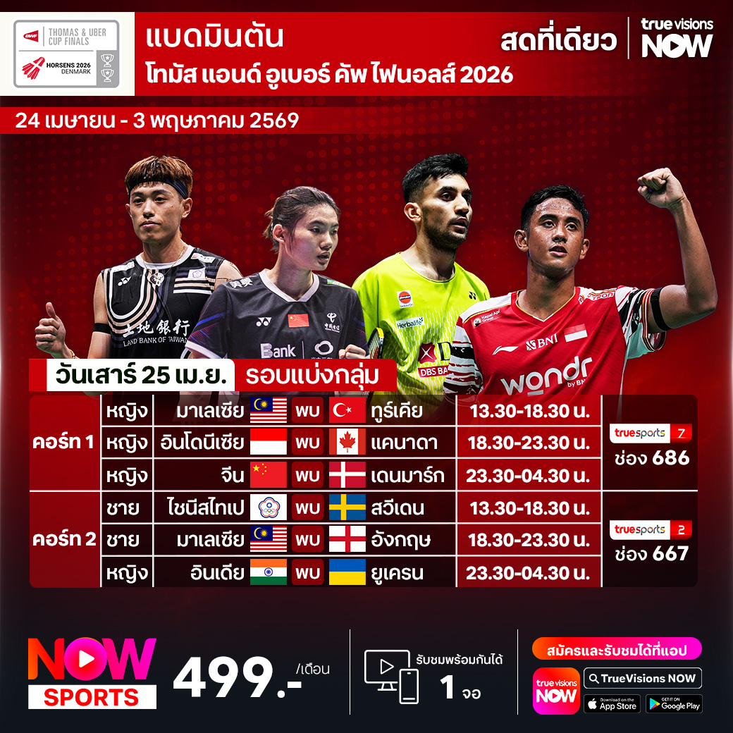 รอบสุดท้าย ที่ชาติชั้นนำของกีฬาแบดมินตันจากทุกทวีป นำโดย จีน, เกาหลีใต้, ญี่ปุ่น, อินโดนีเซีย, มาเลเซีย, เดนมาร์ก และ ฝรั่งเศส มากันแบบครบครัน เพื่อพิสูจน์การเป็นหมายเลข 1 ของปี 2026 ที่เมืองฮอร์เซ่น ประเทศเดนมาร์ก ส่งใจเชียร์ทีมแบดมินตันไทยทั้งทีมชายและทีมหญิง สู้สุดใจเพื่อคว้าชัยชนะ ชมสด ที่ ทรูวิชั่นส์