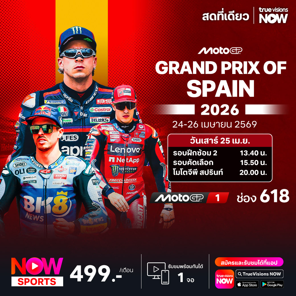 ศึก โมโต จีพี สนามที่ 4 ของฤดูกาล 2026 สัปดาห์นี้ไปประชันความเร็วกันที่ประเทศสเปน กับรายการที่แฟนๆ รอคอย กรังด์ปรีซ์ ออฟ สเปน ที่สังเวียน เฆเรซ เซอร์กิต ที่เป็น โฮม เรซ ของแชมป์โลกอย่าง มาร์ก มาร์เกซ ที่ปีนี้ยังหาแชมป์แรกของปี ไม่เจอ จับตามองการขับเคี่ยวตำแหน่งบนโพเดี้ยมว่าใครจะคว้าตำแหน่งแชมเปี้ยนสนามนี้ไปครอง ชมสด ครบทุกช่วงการแข่งขัน ที่ ทรูวิชั่นส์
