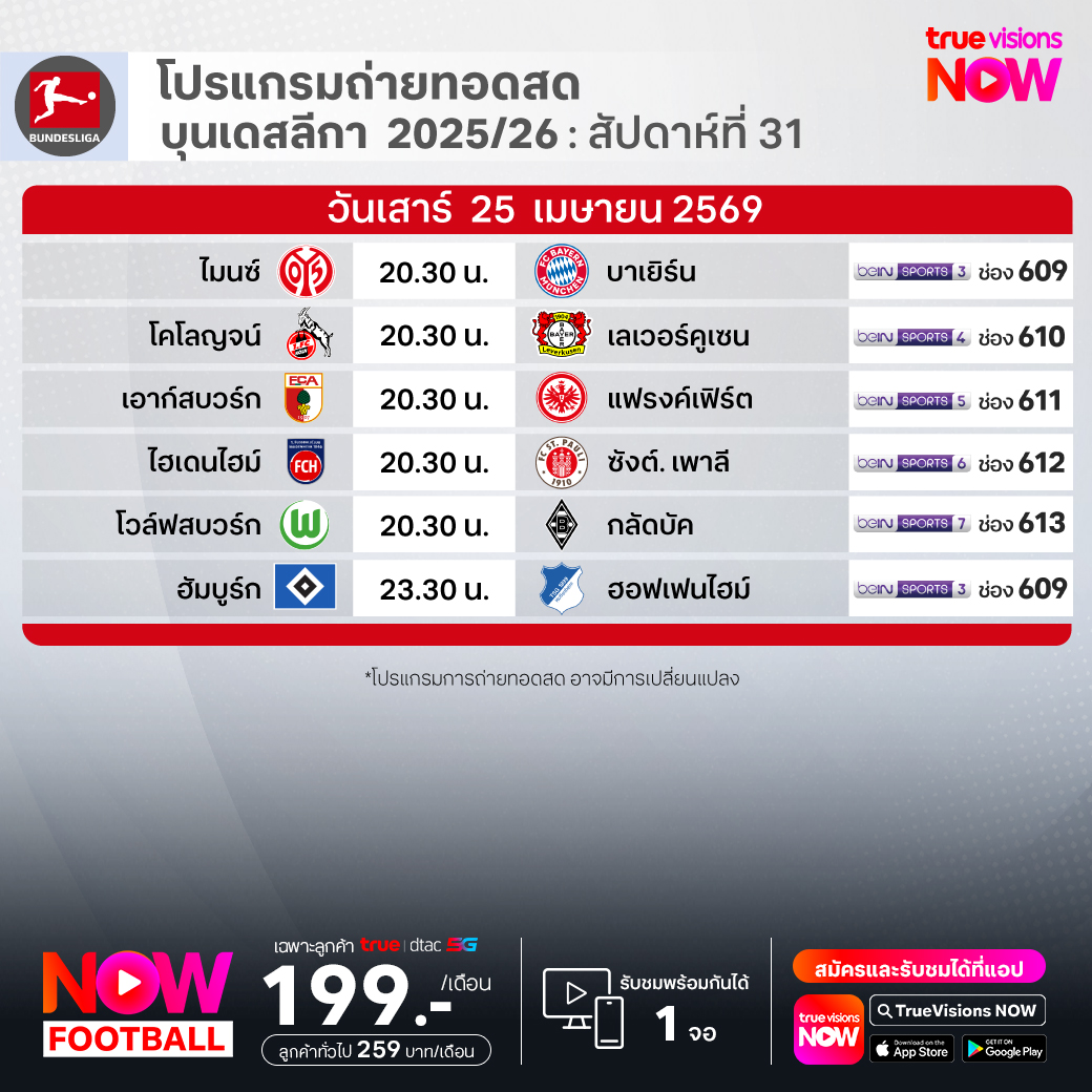 ฮัมบูร์ก พบ ฮอฟเฟนไฮม์ เวลา 23.30-01.30 ทางช่อง beIN 3 (609)