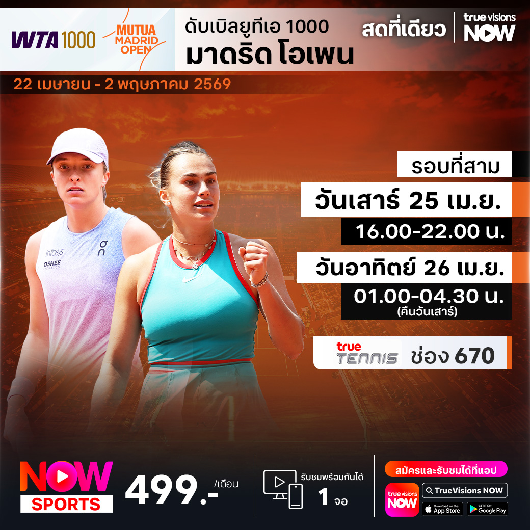 เทนนิสหญิง ดับเบิ้ลยูทีเอ ทัวร์ สัปดาห์นี้พบกับรายการระดับ WTA 1000 ในรายการ มาดริด โอเพ่น ที่กรุงมาดริด ประเทศสเปน รายการนี้รวมนักเทนนิสหญิงระดับโลกเข้าร่วมการแข่งขันกันคับคั่ง และยังเป็นการแข่งขันบนคอร์ทดินแบบพิเศษที่นักเทนนิสต้องปรับตัวกันมากกว่ารายการอื่นๆ ที่เป็นคอร์ทดินแบบปกติ มาร่วมลุ้นกันว่าใครจะคว้าแชมป์ปีนี้ไปครอง ชมสด ครบทุกรอบ ที่ ทรูวิชั่นส์