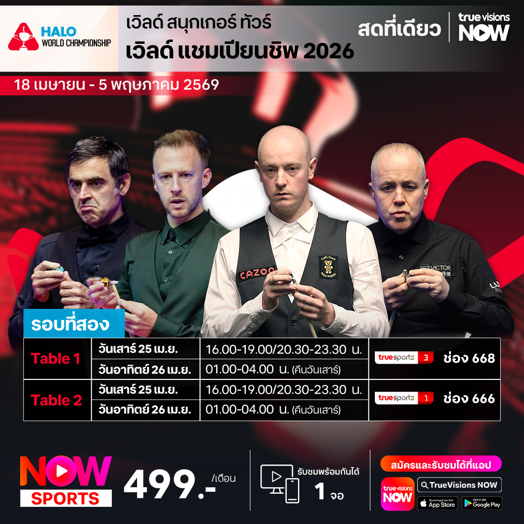การรอคอยของแฟนๆ สิ้นสุดลงแล้ว เมื่อการแข่งขันที่ยิ่งใหญ่ที่สุดในประวัติศาสตร์ของกีฬาสนุกเกอร์ เดินทางมาถึง ครูซิเบิ้ล เธียเตอร์ ในเมืองเชฟฟิลด์ ประเทศอังกฤษ กับสนุกเกอร์ชิงแชมป์โลก หรือ เวิลด์ แชมเปี้ยนชิพ 2026 ที่จะเป็นการเปิดศึกของบรรดามือระดับสุดยอดของโลก โดยมีตำแหน่งแชมป์โลกเป็นเดิมพัน ร่วมสัมผัสประสบการณ์ที่สุดตื่นเต้น เร้าใจ เกมที่คู่คี่ สูสี ดวลคิวกันแบบมาราธอนใครนิ่ง ใครแม่น ใครจะผ่านความมกดดันระดับมหาศาลไปได้ ชมสด ครบทุกนาที ครบทุกแมตช์ ที่ ทรูวิชั่นส์