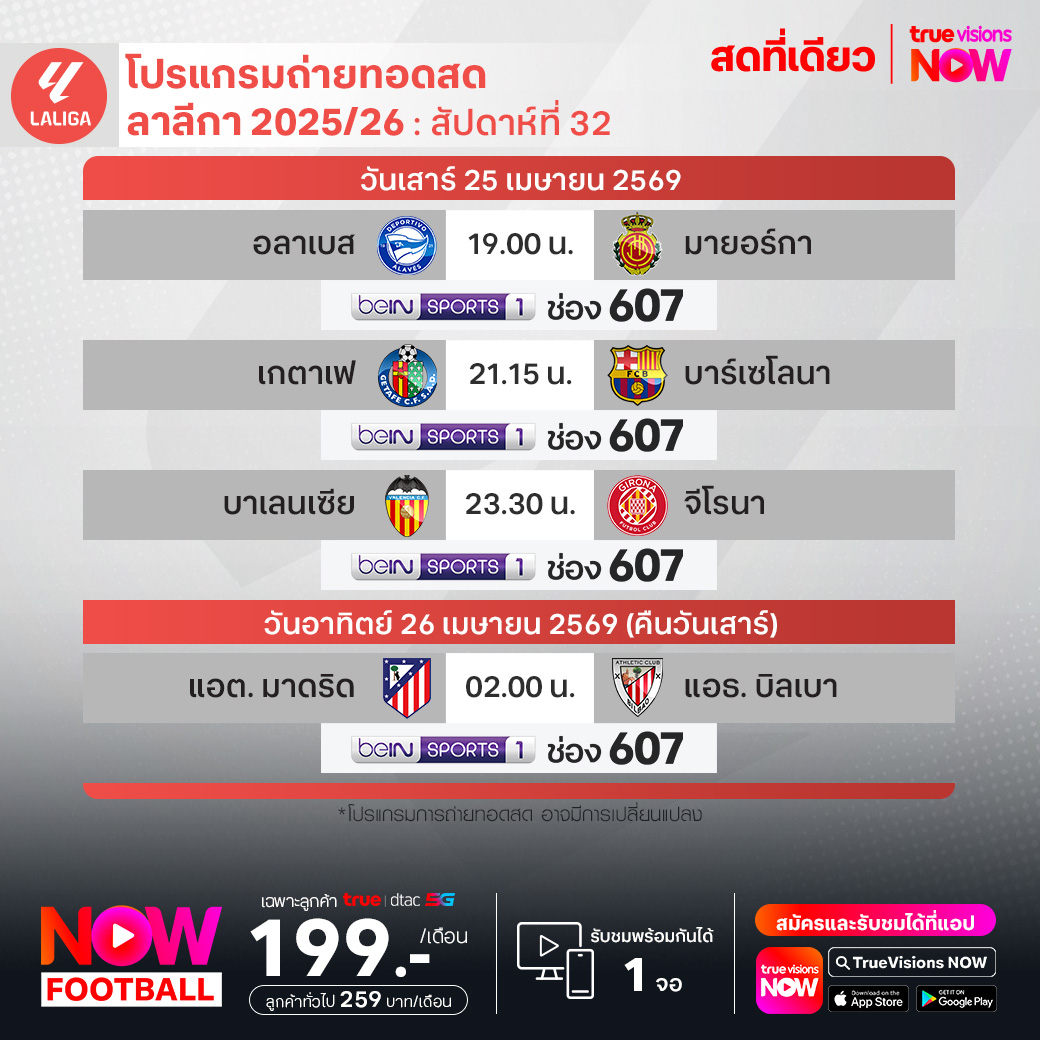 วันนี้มีอะไรดูที่ ทรูวิชั่นส์ ประจำวันเสาร์ที่ 25 เมษายน 69 ยังคงมีกีฬาที่น่าสนใจให้ได้ตามลุ้นตามเชียร์กันเหมือนเดิม โดยในส่วนของฟุตบอลยังมีศึก ลา ลีกา สเปน, บุนเดสลีกา เยอรมนี, กัลโช่ เซเรีย อา อิตาลี, สกอตติช พรีเมียร์ชิพ และ ลีกา 2 เยอรมนี ให้ได้ตามเชียร์กันต่อ ส่วนกีฬาอื่นๆ คอมอเตอร์สปอร์ต พลาดไม่ได้กับศึก โมโต จีพี รายการ กรังด์ปรีซ์ ออฟ สเปน นอกจากนี้ยังมี เทนนิสหญิง ดับเบิ้ลยูทีเอ ทัวร์ รายการ มาดริด โอเพ่น, กอล์ฟ เอเชียน ทัวร์ รายการ สิงคโปร์ โอเพ่น, กอล์ฟหญิง เคแอลพีจีเอ ทัวร์ รายการ ดุคชิน อีพีซี แชมเปี้ยนชิพ, เวิลด์ สนุกเกอร์ ทัวร์ รายการ เวิลด์ แชมเปี้ยนชิพ, แบดมินตัน โธมัส แอนด์ อูเบอร์ คัพ ไฟนอลส์ 2026, เมเจอร์ ลีก เบสบอล, ยูเอฟซี ไฟต์ ไนท์ และ มวยไทย ดิ อัลติเมท มวยไทย เอ็กซ์พีเรียนซ์ งานนี้ ทรูวิชั่นส์ จัดเต็มให้ชมกันถึงบ้าน