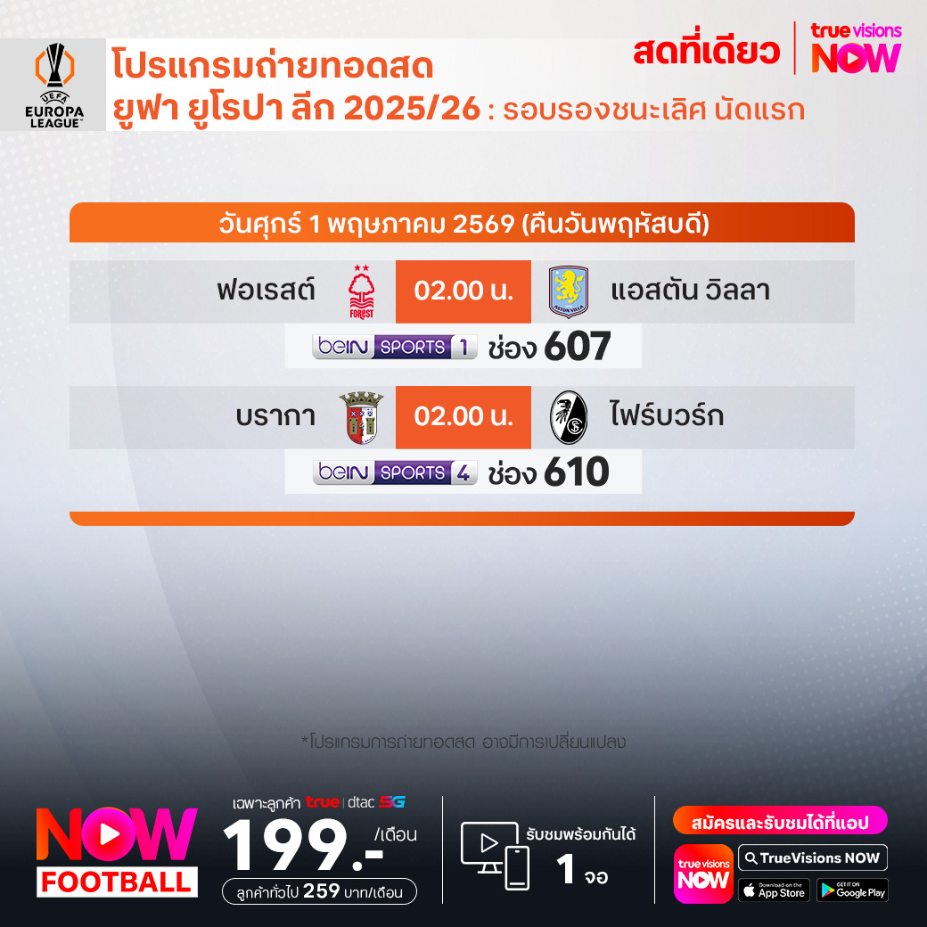 บราก้า พบ ไฟร์บวร์ก เวลา 02.00-04.00 ทางช่อง beIN 4 (610)