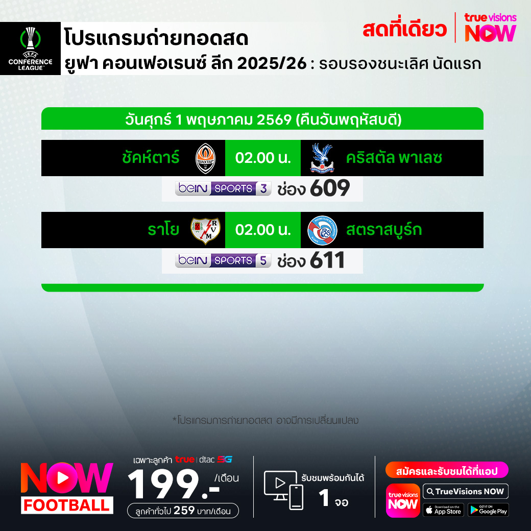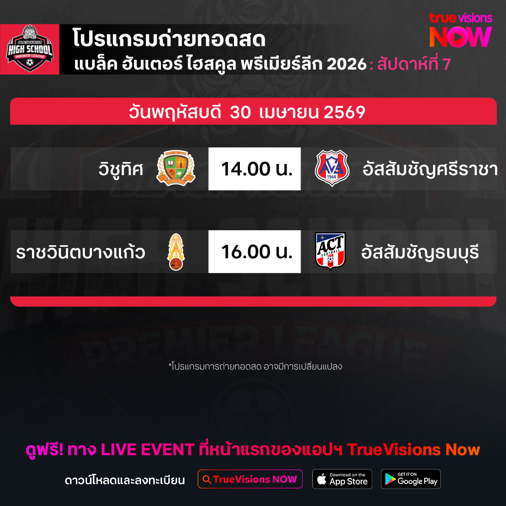วันนี้มีอะไรดูที่ ทรูวิชั่นส์ ประจำวันพฤหัสบดีที่ 30 เมษายน 69 ยังคงมีกีฬาที่น่าสนใจให้ได้ตามลุ้นตามเชียร์กันเหมือนเดิม โดยในส่วนของฟุตบอลยังมีศึก ยูฟ่า ยูโรป้า ลีก และ ยูฟ่า คอนเฟอเรนซ์ ลีก รอบรองชนะเลิศ นัดแรก รวมถึง ฟุตบอลนักเรียน แบล็ค ฮันเตอร์ ไฮสคูล พรีเมียร์ลีก ให้ได้ตามเชียร์กันต่อ ส่วนกีฬาอื่นๆ ยังมี เทนนิสหญิง ดับเบิ้ลยูทีเอ ทัวร์ รายการ มาดริด โอเพ่น, กอล์ฟ เอเชียน ทัวร์ รายการ แมคยอง โอเพ่น กอล์ฟ แชมเปี้ยนชิพ, กอล์ฟหญิง เคแอลพีจีเอ ทัวร์ รายการ ดีบี วีเมนส์ แชมเปี้ยนชิพ, เวิลด์ สนุกเกอร์ ทัวร์ รายการ เวิลด์ แชมเปี้ยนชิพ, แบดมินตัน โธมัส แอนด์ อูเบอร์ คัพ ไฟนอลส์ 2026, แบดมินตัน โตโยต้า เยาวชนชิงชนะเลิศแห่งประเทศไทย, เมเจอร์ ลีก เบสบอล และ มวยไทย ดิ อัลติเมท มวยไทย เอ็กซ์พีเรียนซ์ งานนี้ ทรูวิชั่นส์ จัดเต็มให้ชมกันถึงบ้าน